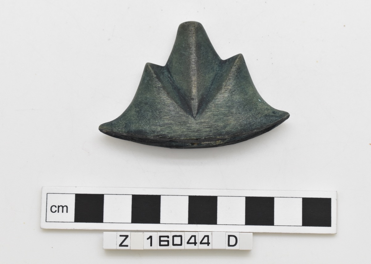Wooden reconstruction of pommel with curved base and three pointed lobes.