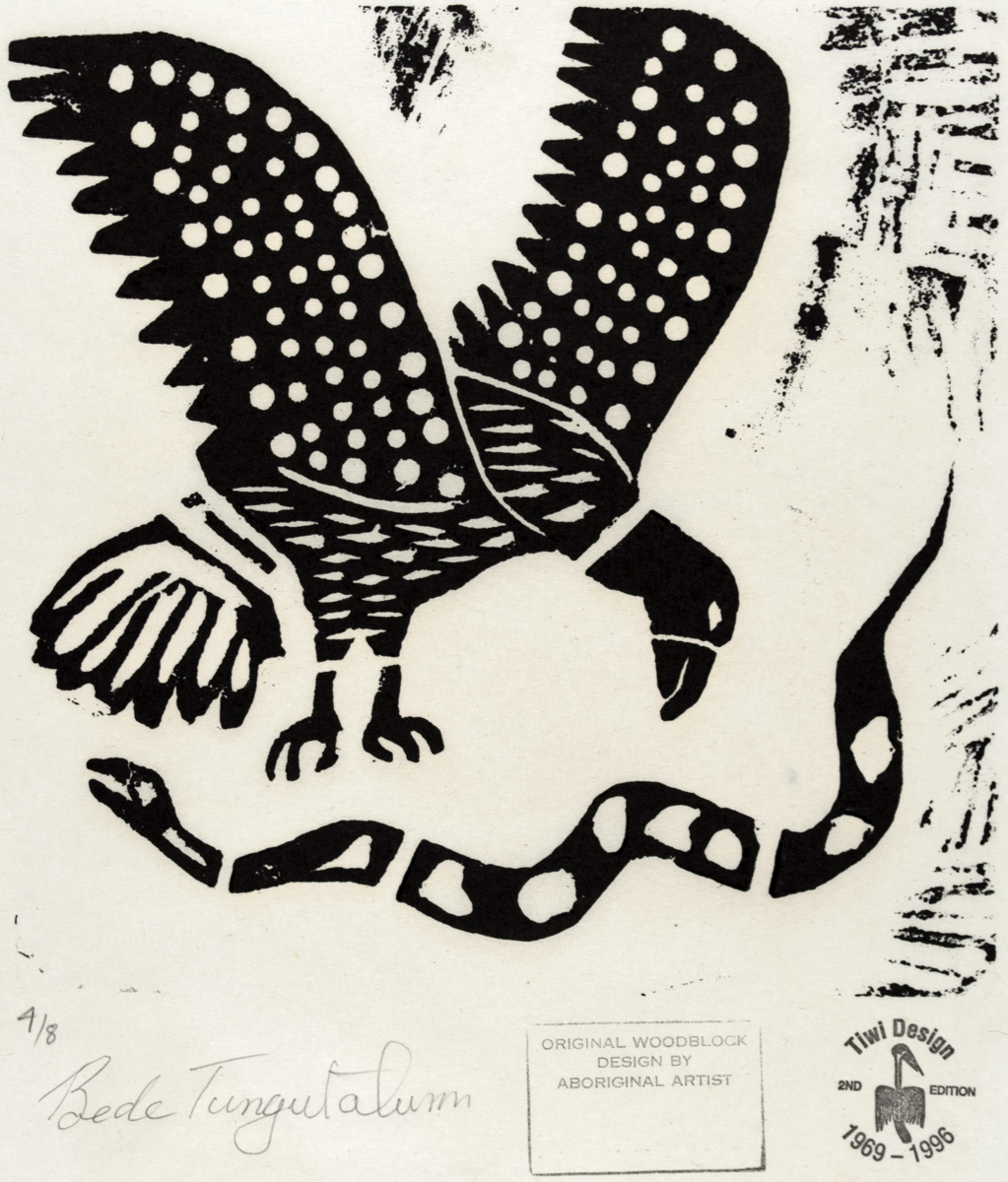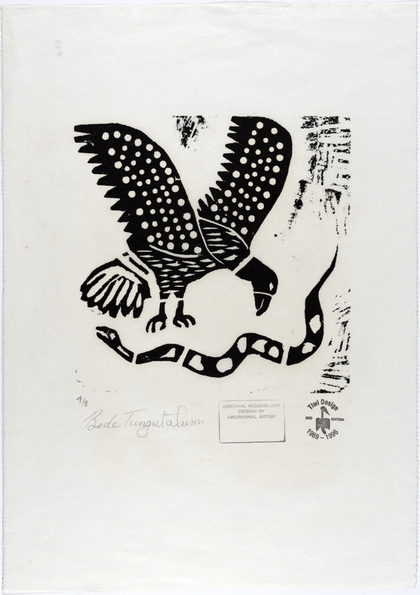 Woodblock print in black by Bede Tungatalum, untitled and undated. Edition number 4/8. The image shows a bird and a snake. Two stamps are beneath the image. One rectangular stamp reads 'ORIGINAL WOODBLOCK DESIGN BY ABORIGINAL ARTIST'. The second stamp is a circular design in which reads 'Tiwi Design 2ND EDITION 1969-1996' with an image of a bird in the centre. Signed by the artist in pencil 'Bede Tungutalum'.