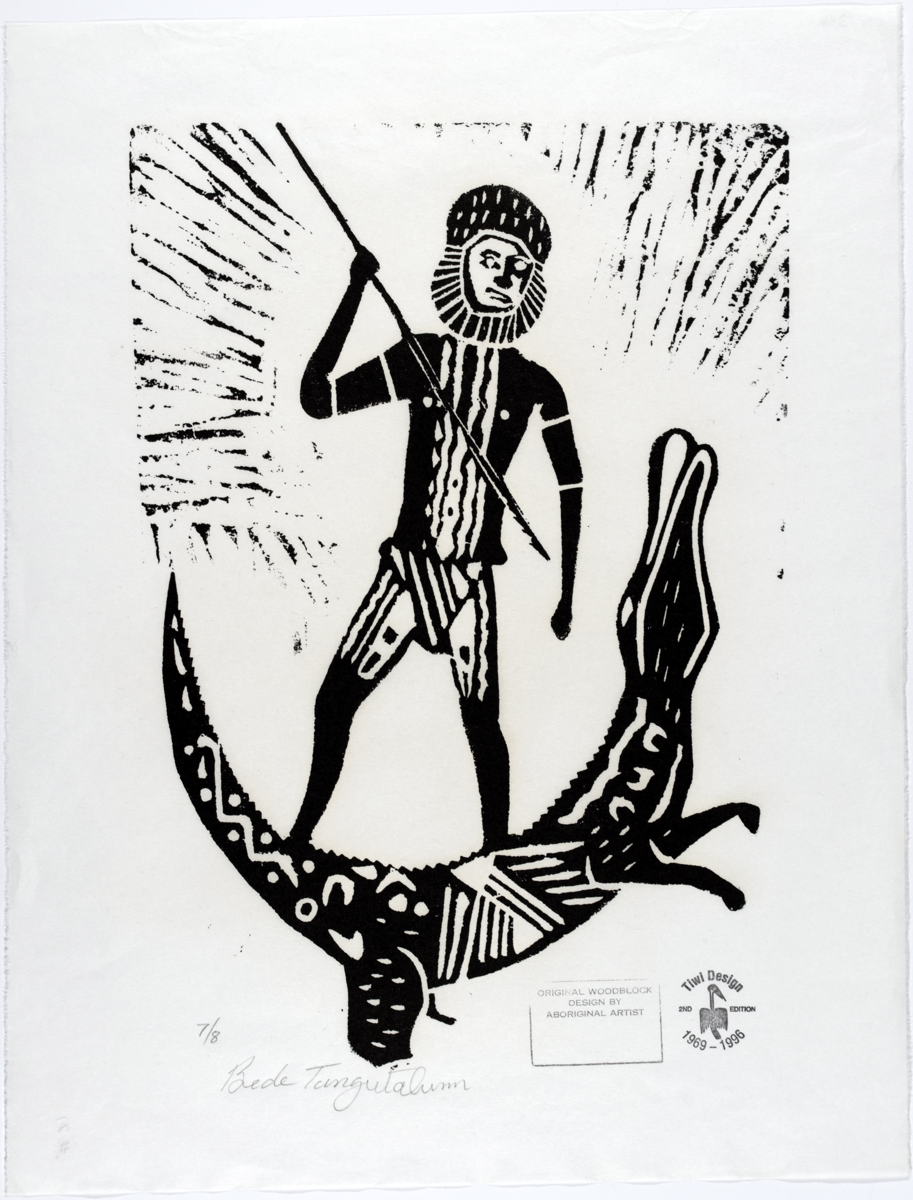 Woodblock print in black by Bede Tungatalum, untitled and undated. Edition number 7/8. The image shows a man and a crocodile. Two stamps are beneath the image. One rectangular stamp reads 'ORIGINAL WOODBLOCK DESIGN BY ABORIGINAL ARTIST'. The second stamp is a circular design in which reads 'Tiwi Design 2ND EDITION 1969-1996' with an image of a bird in the centre. Signed by the artist in pencil 'Bede Tungutalum'.