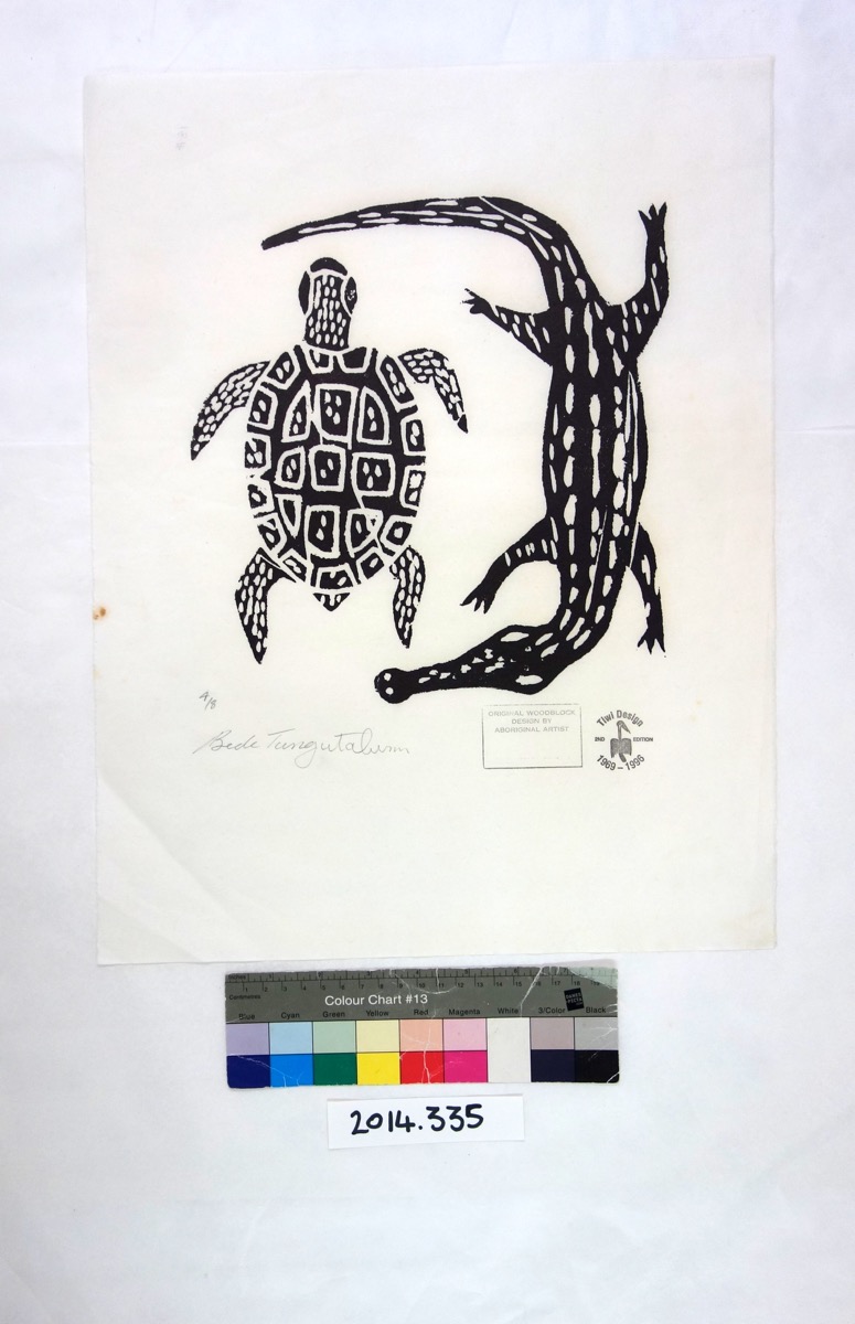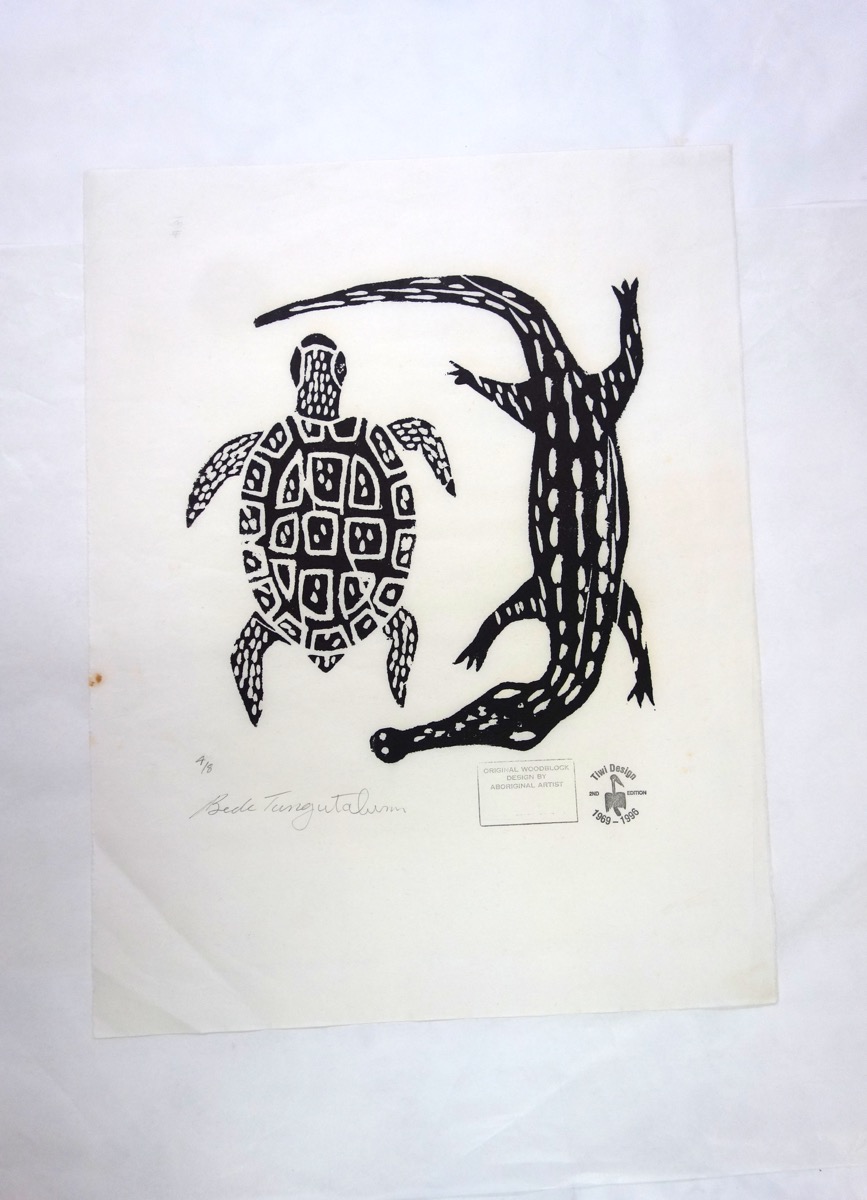 Woodblock print in black by Bede Tungatalum, untitled and undated. Edition number 4/8. The image shows a tortoise and a crocodile. Two stamps are beneath the image. One rectangular stamp reads 'ORIGINAL WOODBLOCK DESIGN BY ABORIGINAL ARTIST'. The second stamp is a circular design in which reads 'Tiwi Design 2ND EDITION 1969-1996' with an image of a bird in the centre. Signed by the artist in pencil 'Bede Tungutalum'.