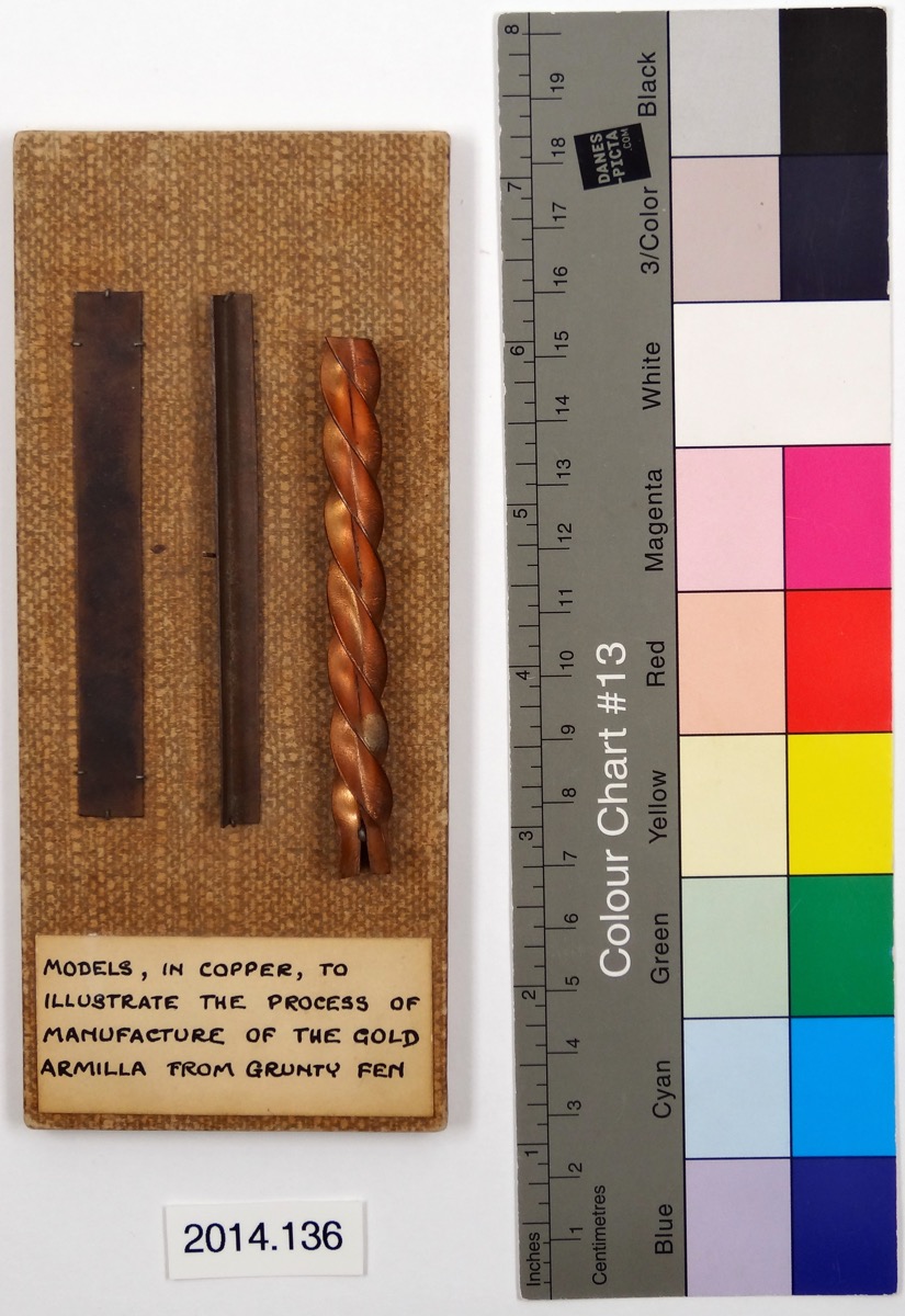 Three copper models illustrating the process of manufacturing the Grunt Fen gold torc (Z 15078). Mounted on board.