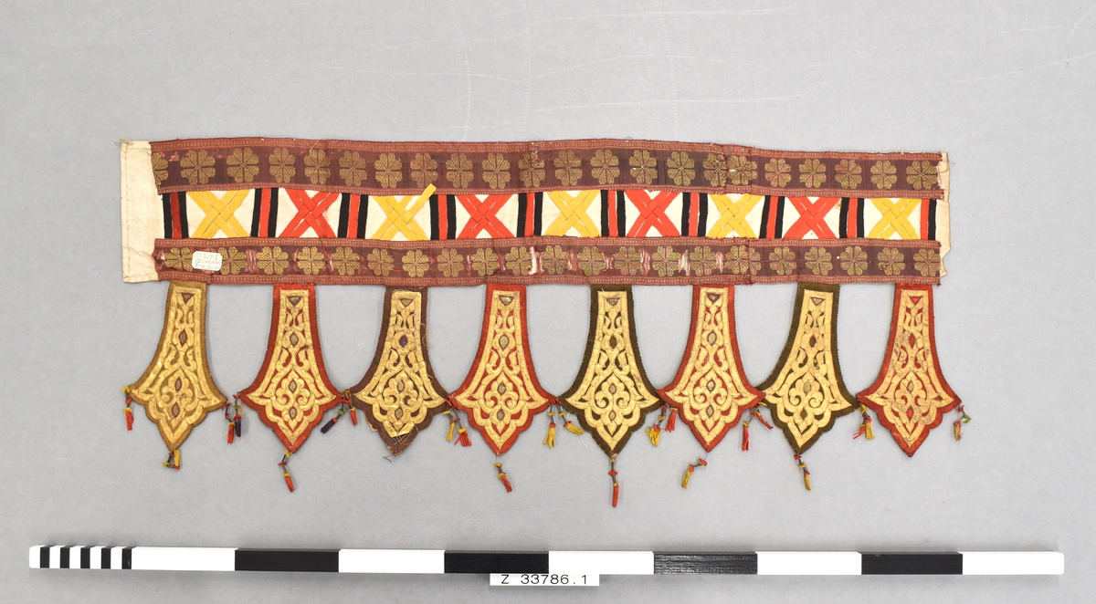 2 woven red strips of red fabric with gilt metal thread detail lined with cream cotton, 2 strips joined with wool strips of red, black and yellow; from the lower strip fabric drops lined with cotton with applique of gilt paper and tassels at corners.