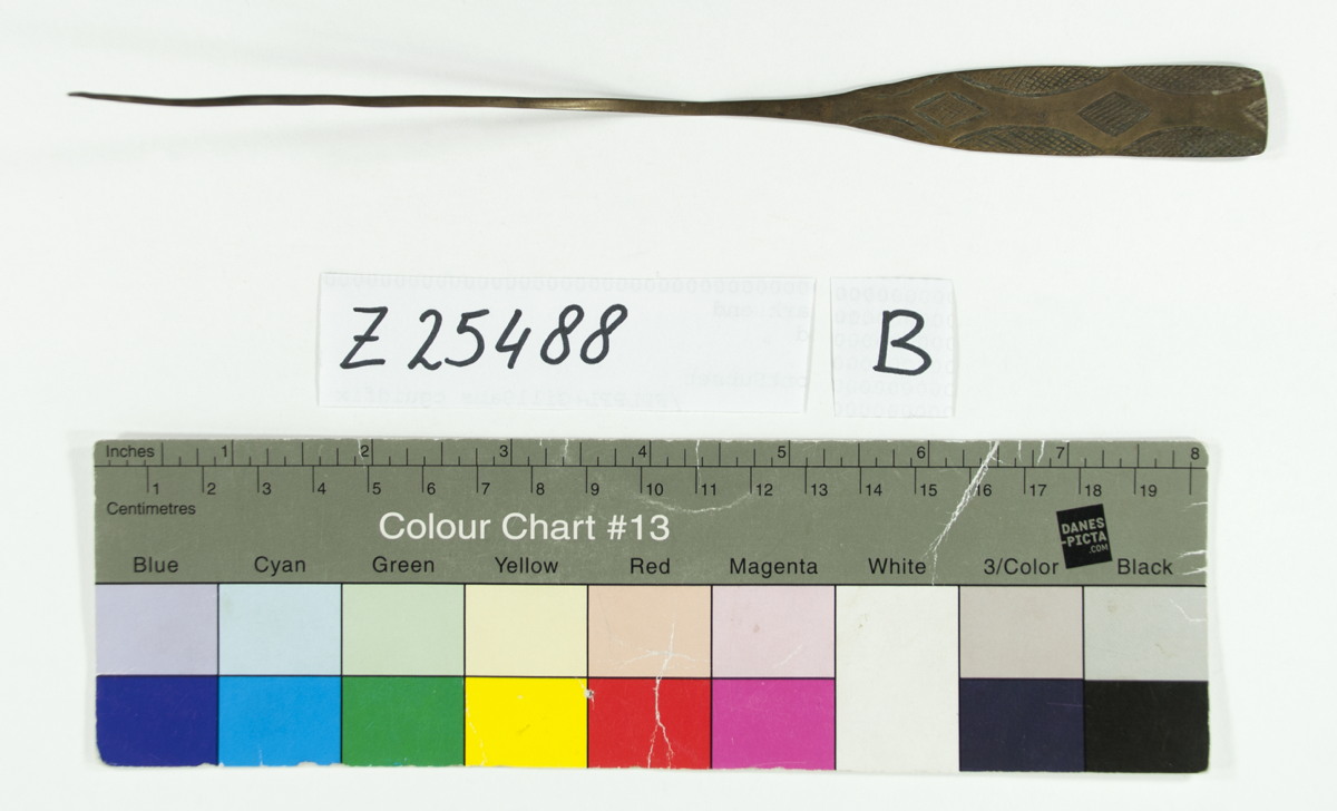 B is a brass hairpin. Profusely decorated on the head segment with semi circular shapes filled in with crosshatchings. The centre sports diamond shapes that are filled with similar lines, leaving plain undecorated spaces between the abovementioned shapes. Information provided by Dr Ohioma Pogoson, Honorary Curator of the Museum of the Institute for African Studies, University of Ibadan, Nigeria. January 2013.