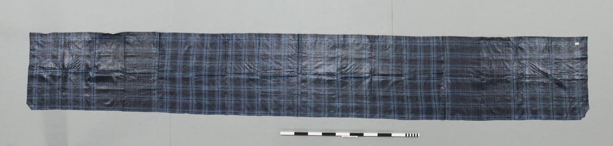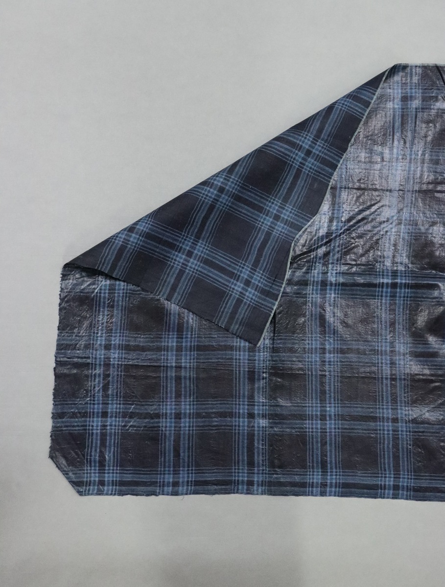 Narrow length of blue checked fabric, waxed on one side.