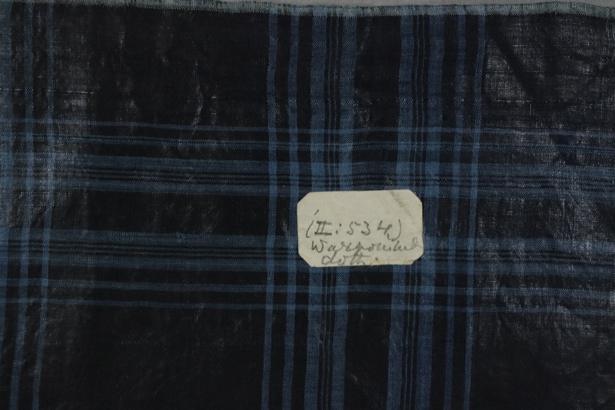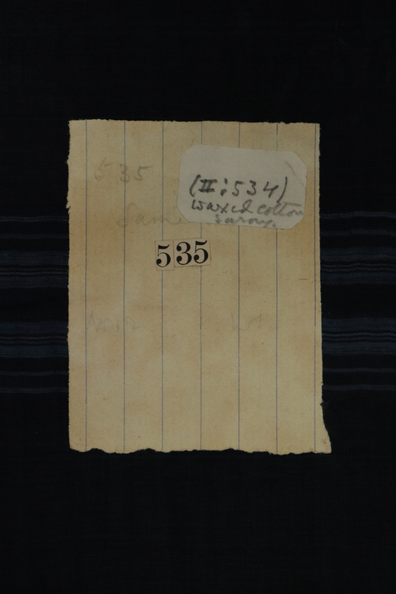 Label one reads in pencil '(II 535/ wax polished cloth). The second label reads in pencil (II 534)/ wax cotton sarong'.