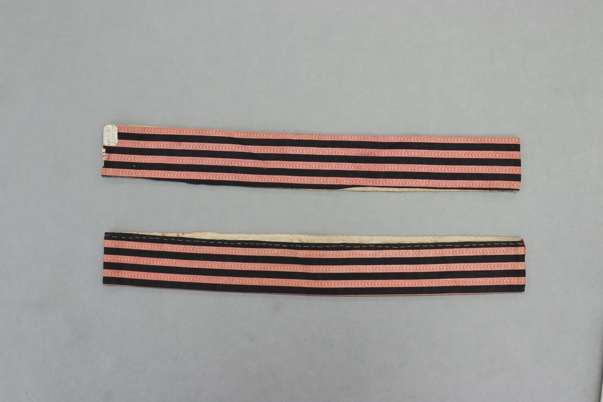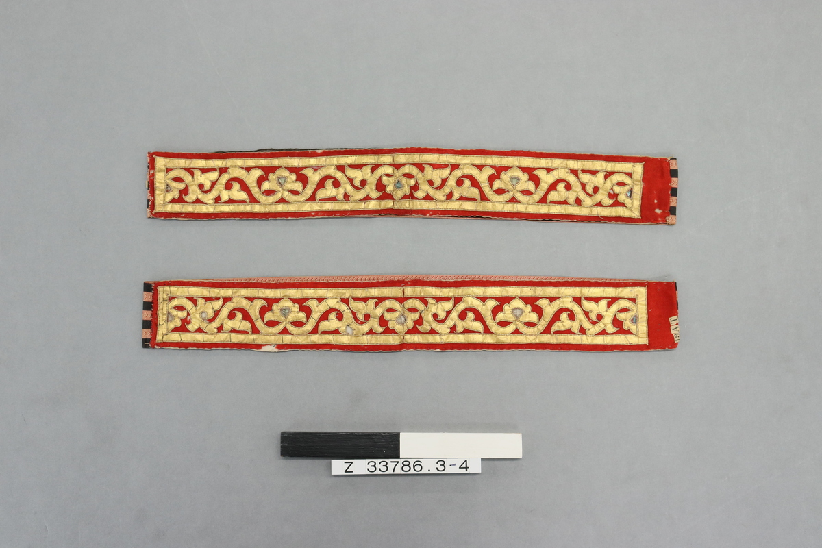 Small rectangular joined strips of fabric. The front red woollen section is decorated with curvilinear designs in gold ?paper, inlaid with colored, glass, (most missing), and backed with plain white cotton. The rear is black and red/white stripes with chevrons. Insect, ?moth, damage to woollen strips. Metal pin removed suggested display history