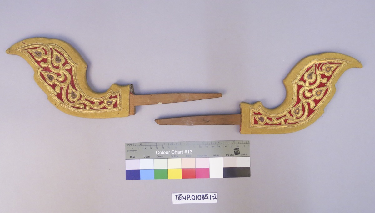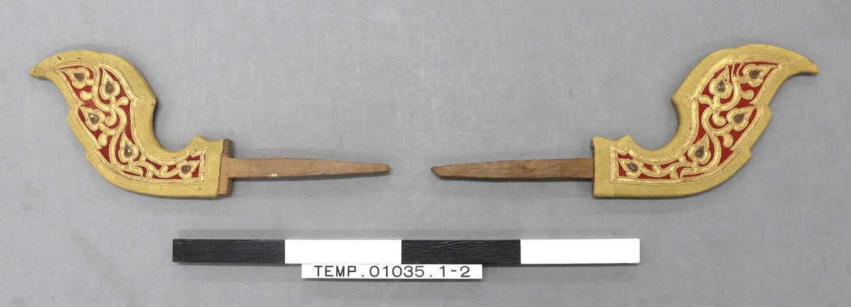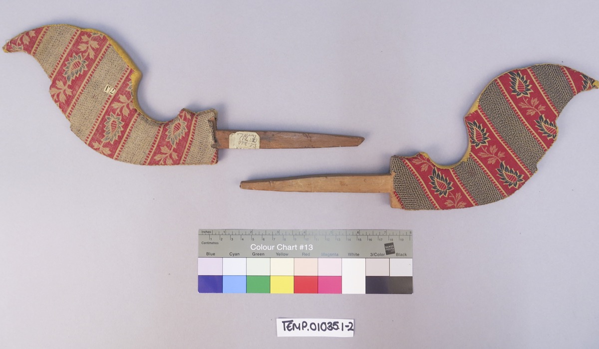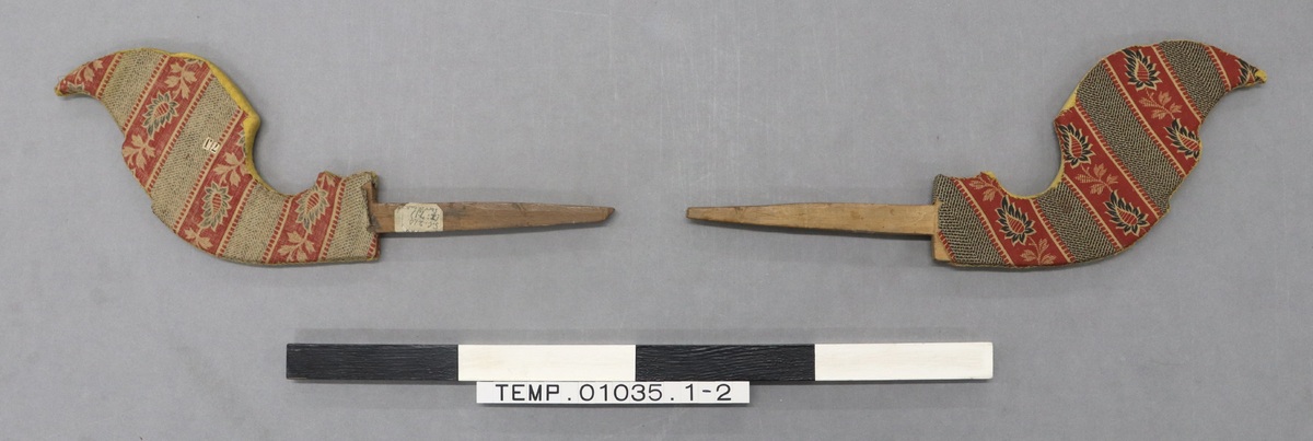 Catalogue of First Skeat Collection (1899): '210-212. Two pairs of scroll-shaped ends for curtain rods, covered, as has recently become the fashion, with embroidered cloth; and a single, old, carved, end...'