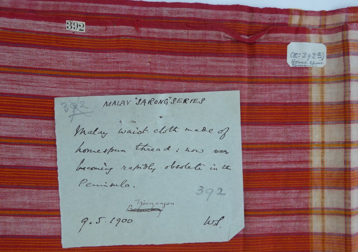 Large handwritten paper label attached "MALAY "SARONG" SERIES/ Malay waist cloth made of/ homespun tread: now [word crossed out]/ becoming rapidly obsolete in the Peninsular./ Tremangan [This replaces crossed out word [?] Belanbang [?]/ 5.5.1900/ [signed] W.S."