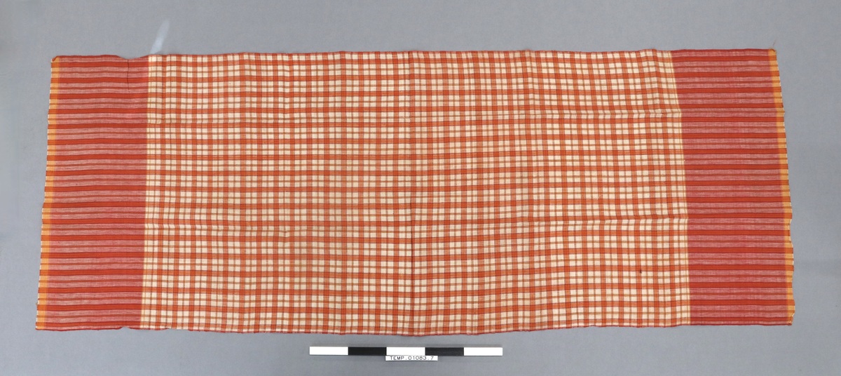 waist cloth made of homespun cloth in red, orange, cream and blue checks, striped at ends. Cut and fraying on length ends