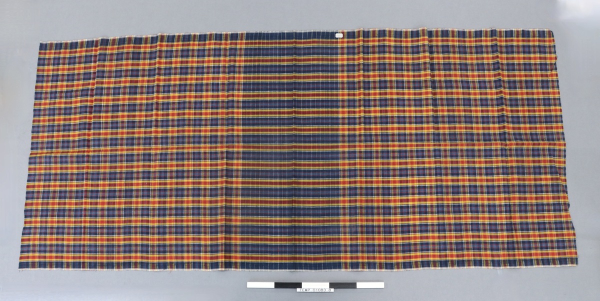 Sarong made of a length of starched cotton cloth. Woven with a checked pattern of white, blue, red, and yellow stripes; denser area of blue towards the middle.