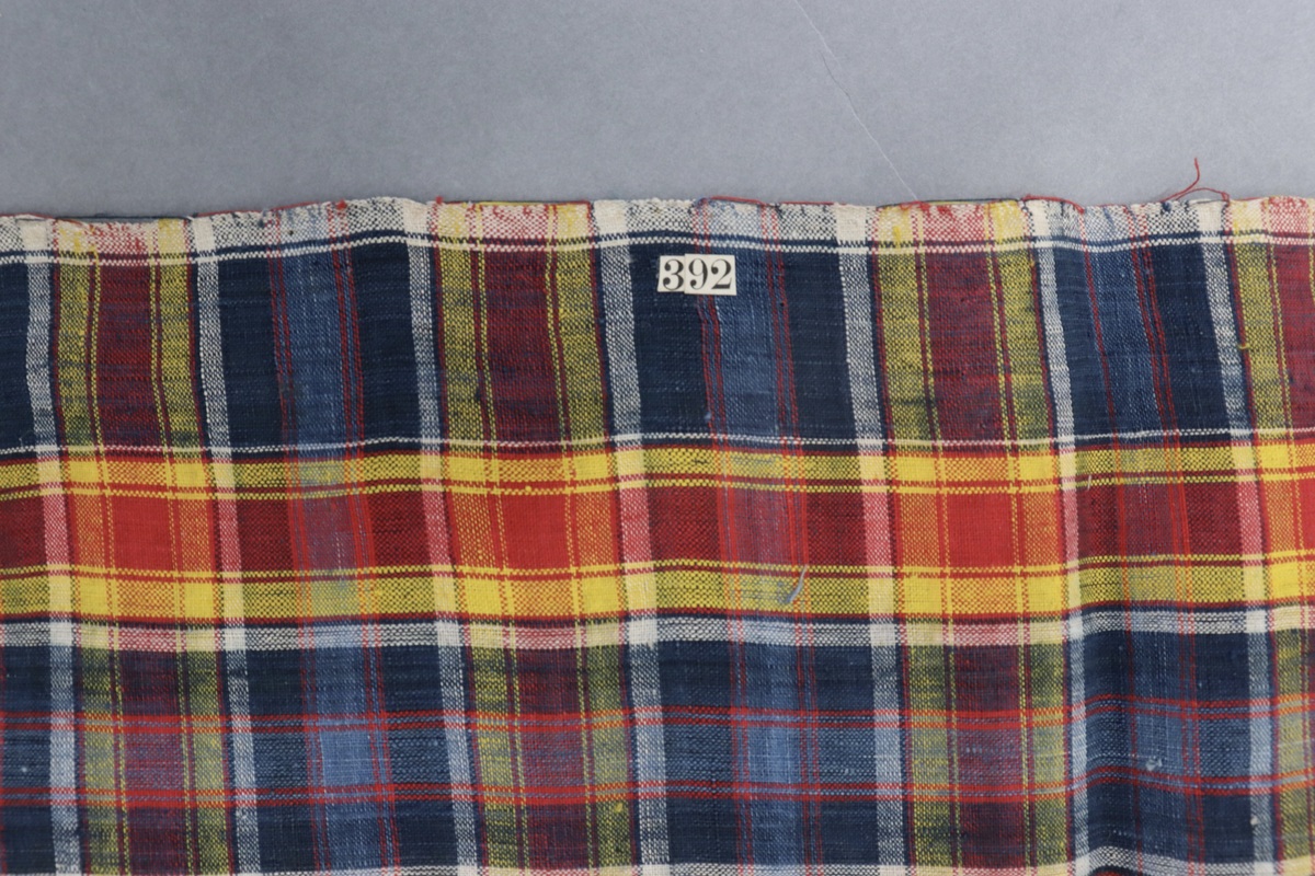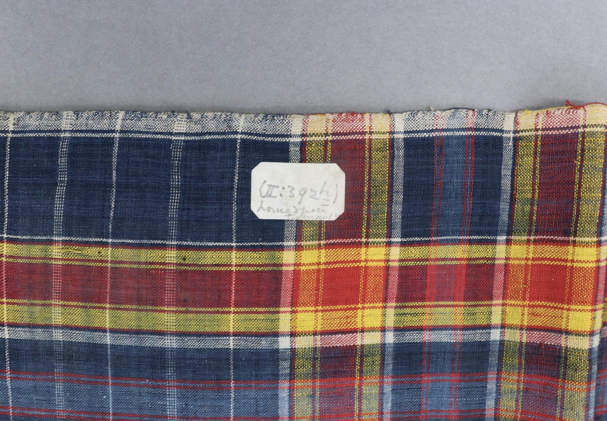 Waist cloth or sarong made of homespun cloth in blue, red, yellow, cream checks. Cut and fraying on length ends