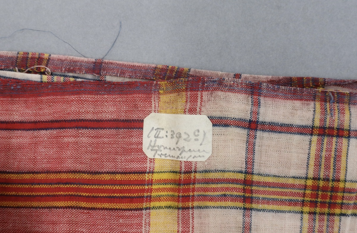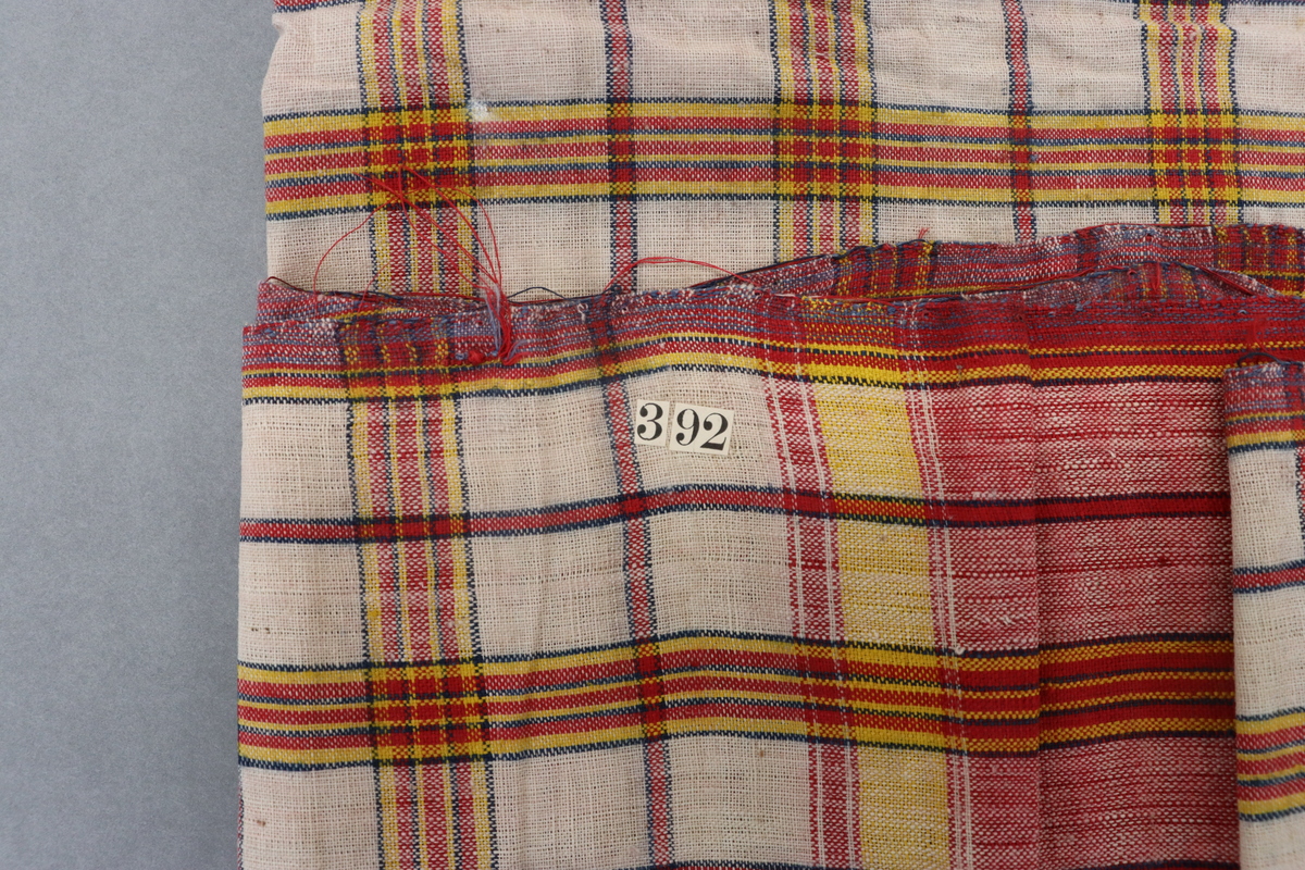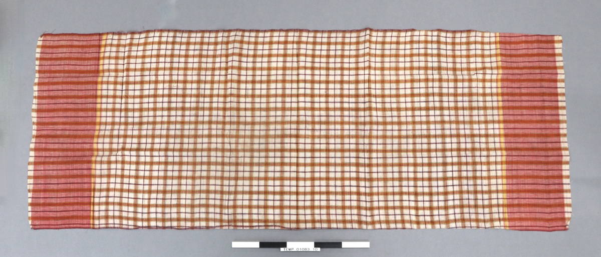 Waist cloth or sarong made of homespun cloth in cream with red and yellow checks outlined in blue and striped at end. Cut and fraying on length ends