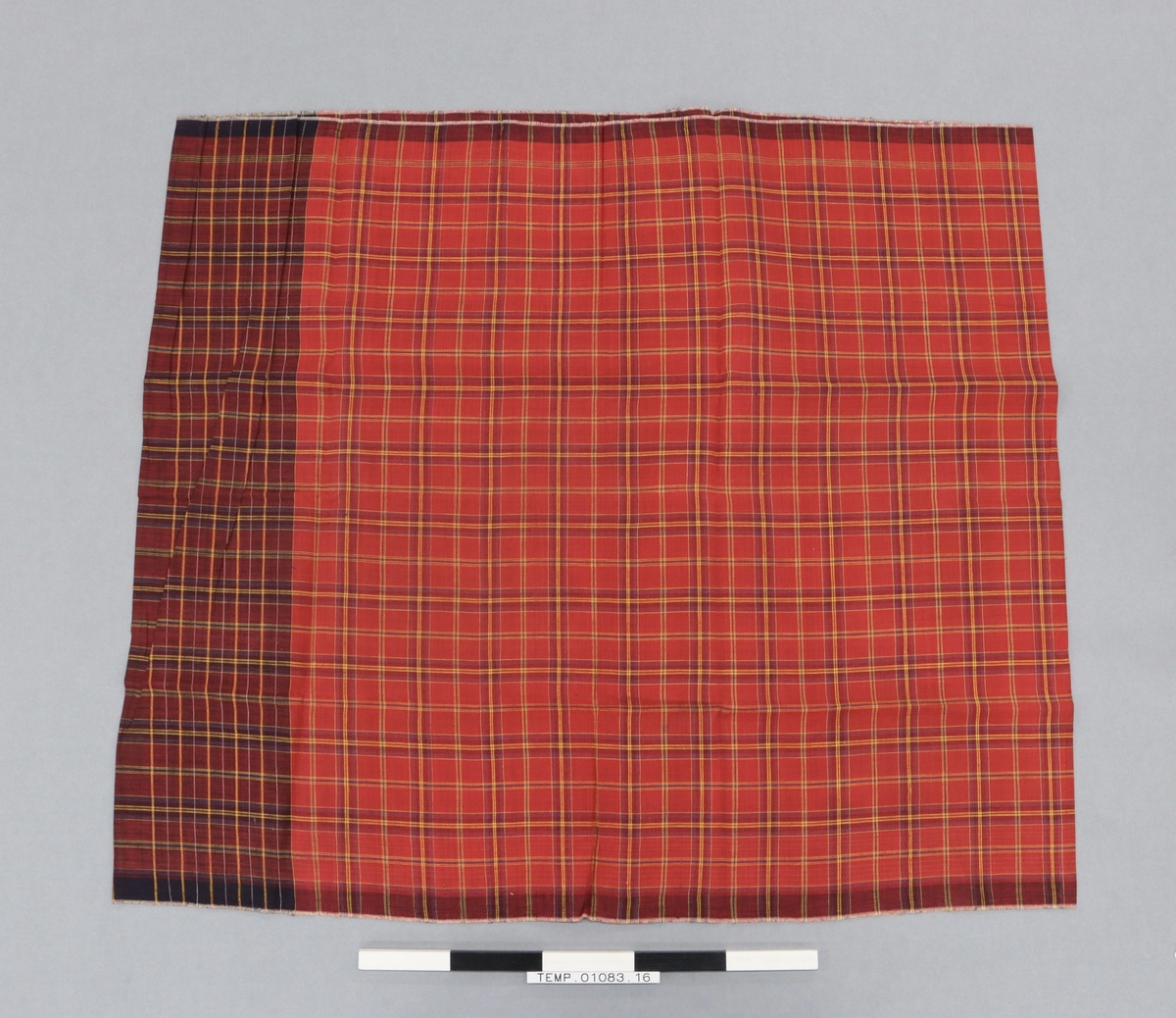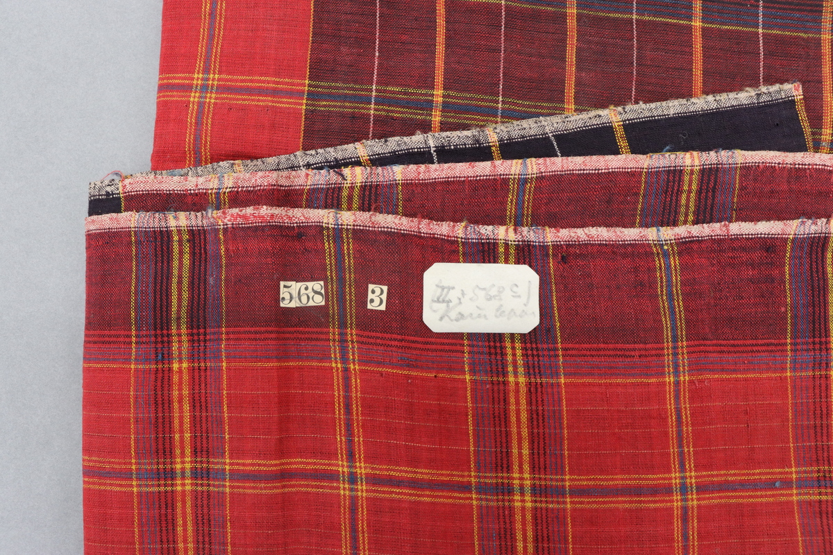 Kain lepas. Sarong of woven starched cotton cloth sewn into a tube. Red background woven with a checked pattern of yellow, black, and blue stripes; denser area of black at one side.