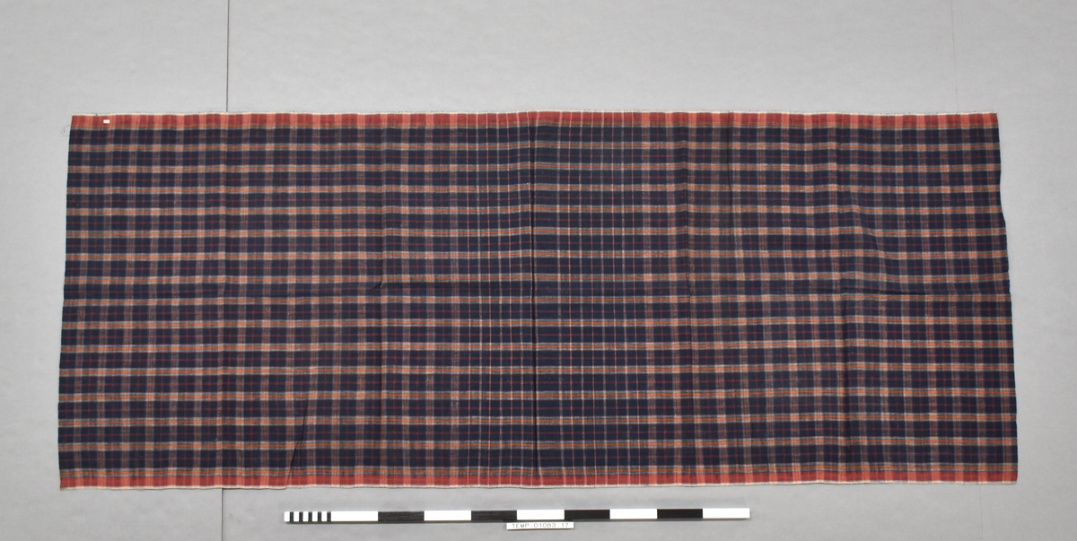Kain limau. Sarong. Long rectangular single weft fabric with a checkered pattern on a blue backing with red and white lines. Red border at both edges.