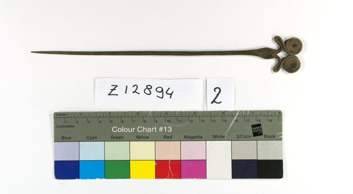 Catalogue card for Z 12894[.1-2]: 'Two wrought brass hair-pins. No decoration on reverse side. [Added in different hand] Both have 2 spirals on the top of the pin.'
