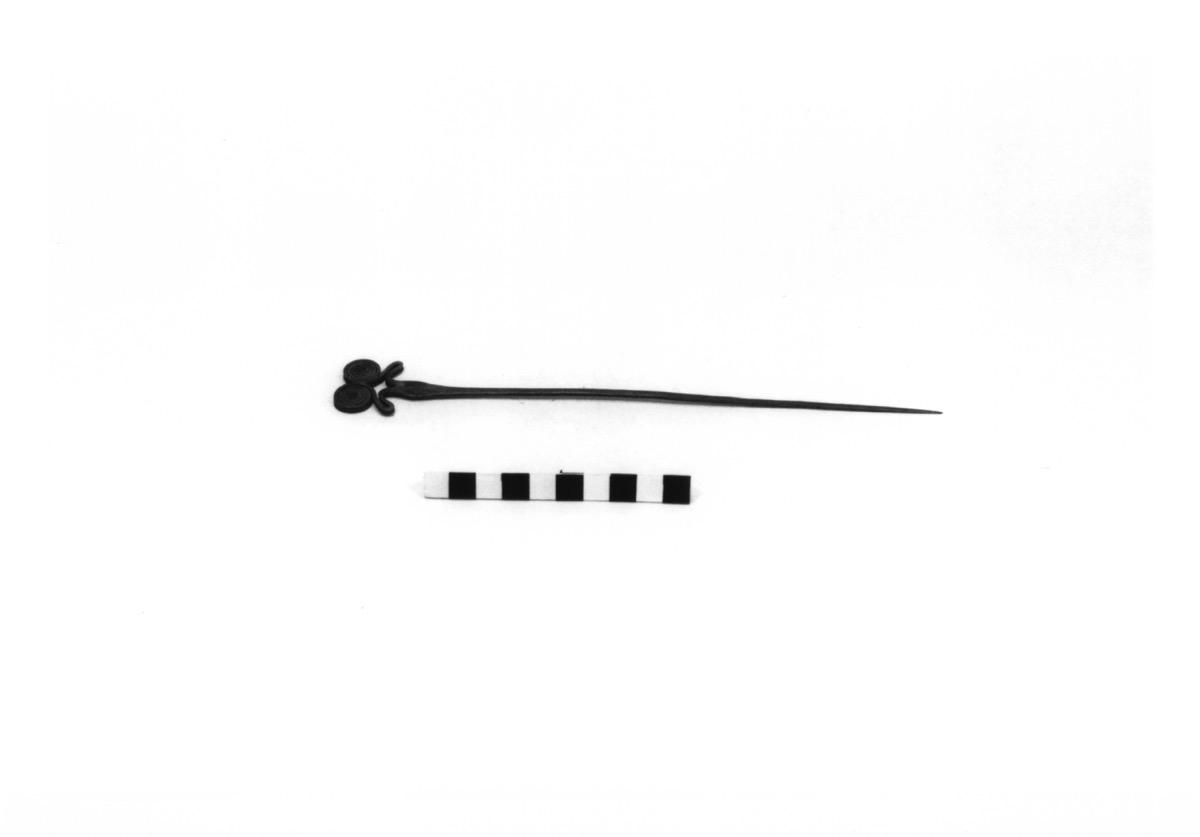 Description for Z 12894[.1-2]: 1 is a curved (bow-like) brass hairpin with designs beaten onto the body such as dots, circles and lines. The pin tapers into a narrow point. At the head of the pin two spirals are situated next to each other, beaten down in a flat shape. Each spiral has a hole in the middle. 2 is a brass hairpin similar in design to 1 but no holes are present in the spirals and the beaten designs are spread out more. Neither pin has designs on the reverse side. Similar to Z 25492, Z 12505, Z 12372, Z 12847, Z 25463, Z 12921, Z 25492 and Z 25464 in design. It is important to note that all brass pins with this design are from Okpe, whereas the iron ones are from Ijeba. Information provided by Dr Ohioma Pogoson, Honorary Curator of the Museum of the Institute for African Studies, University of Ibadan, Nigeria. January 2013.