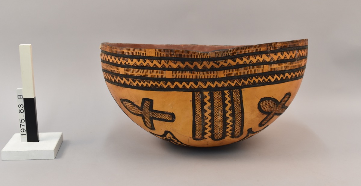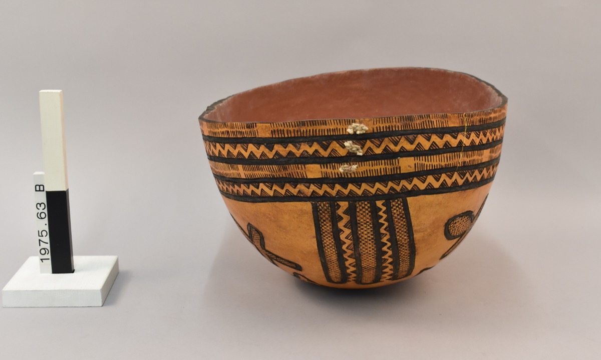 Kal. A large gourd container made from a halved calabash, hemispherical in shape. The outer body has been decorated with black linear and geometric patterns possibly created through pyrography. The inner body has been stained and hardened with a mixture of ochre and squash seed oil. Used to hold cold liquids such as beer and for washing grain and carrying water. Contemporary repair using string to hold a vertical crack at the rim.