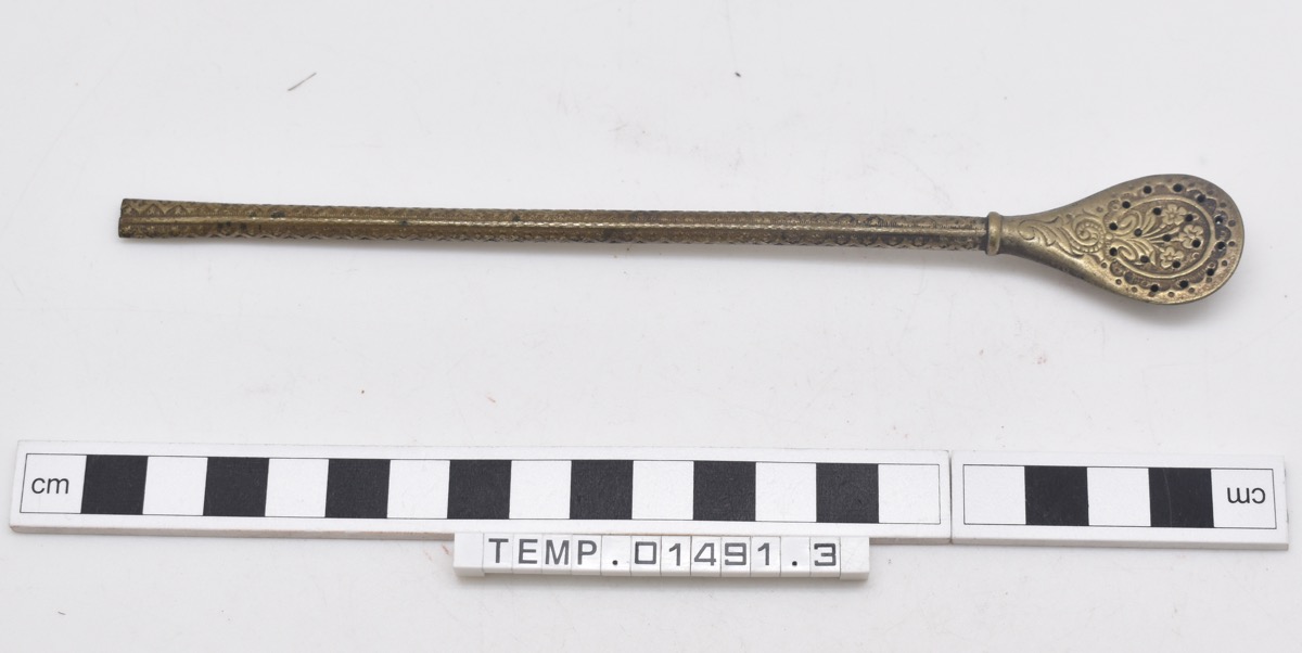 Bombilla. Metal strainer and straw for drinking mate. Straw is decorated with zigzags and dots. Strainer is slightly concave and decorated with a botanical pattern.