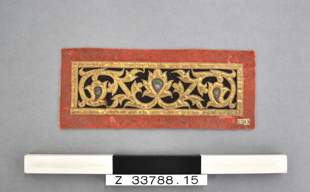 Surutun. Pillow end of red and black wool decorated with gilded paper and glass. Rectangular panel made from woven black wool fabric bordered with red; the centre is decorated with curvilinear motifs outlined with appliquéd gilded paper and with inset coloured glass panels; backed with red wool. Glass panels fragmented with areas missing. Visual pair with Z 33788.14.