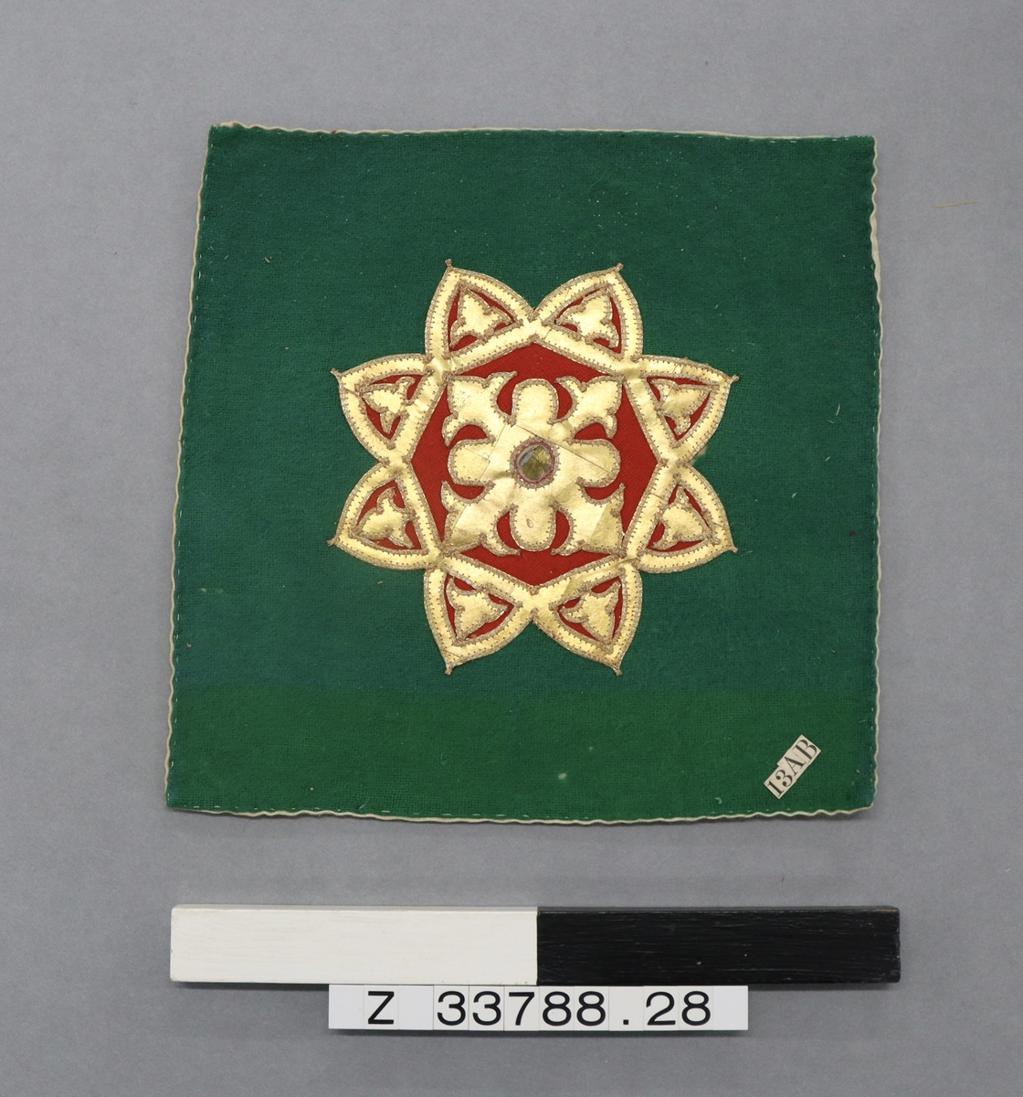 Surutun. Panel for a pillow with gold appliqué work; visually a matching set with Z 33788.29. Square panel of green wool decorated with a central star-like design including trefoils of gold paper on a red background; centrally placed yellow coloured glass panel; backed with white cotton.