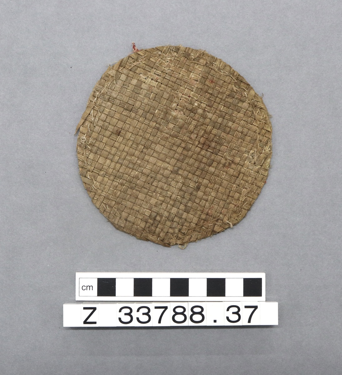 Surutun. Panel for a pillow with embroidery in a floral shape; visually a matching pair with Z 33788.36. Circular panel of cream cloth decorated with floral wool embroidery in red, blue, and green wool, which is now almost entirely missing; stitched onto a layer of woven plant material.