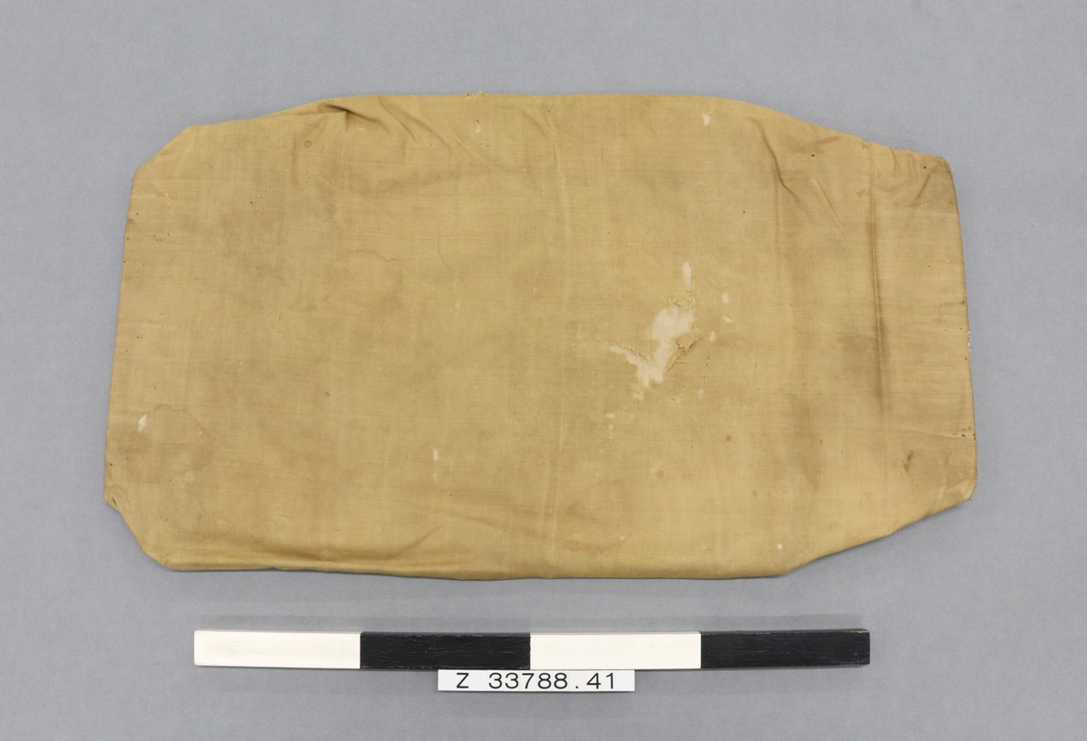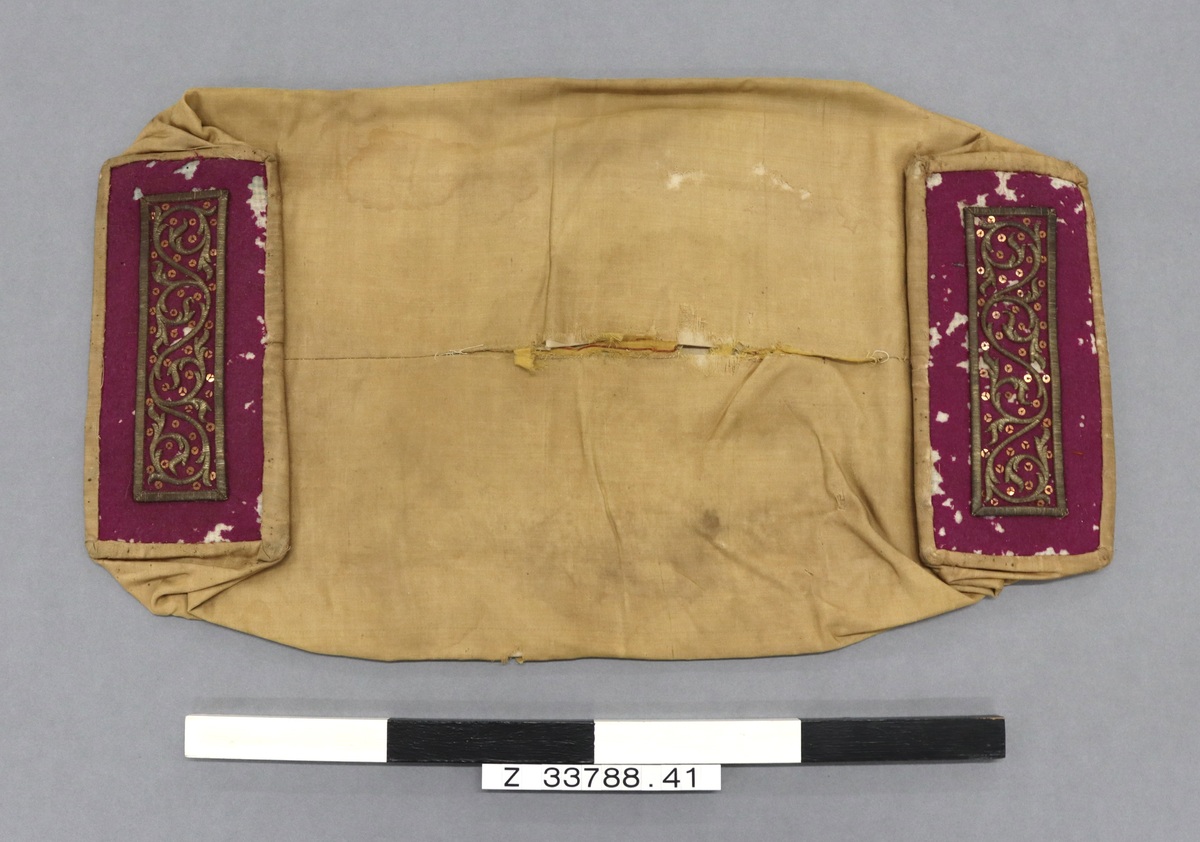 Rectangular pillow with two stiff, decorative ends. Ends are decorated with curvilinear designs of silver-gold metal thread sewn over thick card to create a 3-dimensional effect; metal sequins are interspersed between the design; purple woollen cloth background. Main body of pillow is made of mustard yellow cloth; there is a slit on one side and the stuffing has been previously removed.