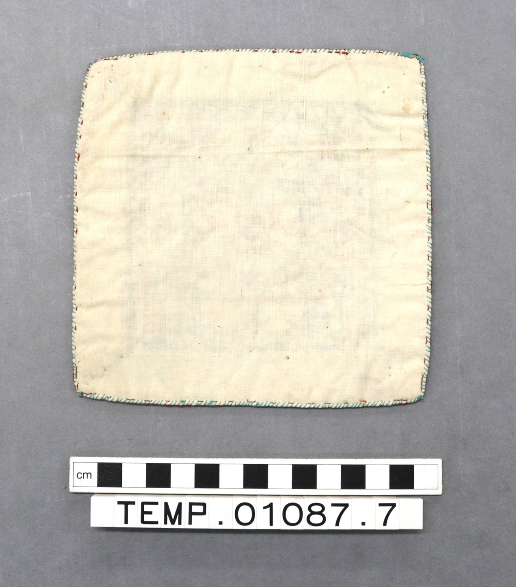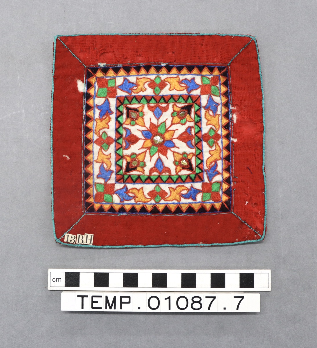 Small square embroidered cloth with flower design in centre. Border of strips of red fabric; embroidered floral design in red, blue, green, and orange on a cream background; central square of embroidery with red and green zigzag border; band of floral embroidery around this with orange and black zigzag border before red edges. Five coloured glass panels in the central square. Green border around edges of cloth and backed with cream cotton cloth.