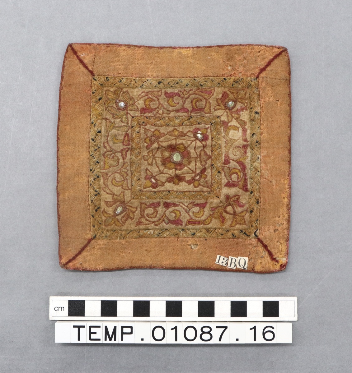 Small square embroidered cloth with floral design in centre. Border of strips of orange fabric; embroidered floral design in red, yellow, and possibly green on a cream background; central square of embroidery with zigzag border; band of floral embroidery around this with zigzag border before orange edges. Five coloured glass panels in the central square; this may have been more prevoiusly, but they are now missing. Red border around edges of cloth and backed with cream cotton cloth that is heavily stained.