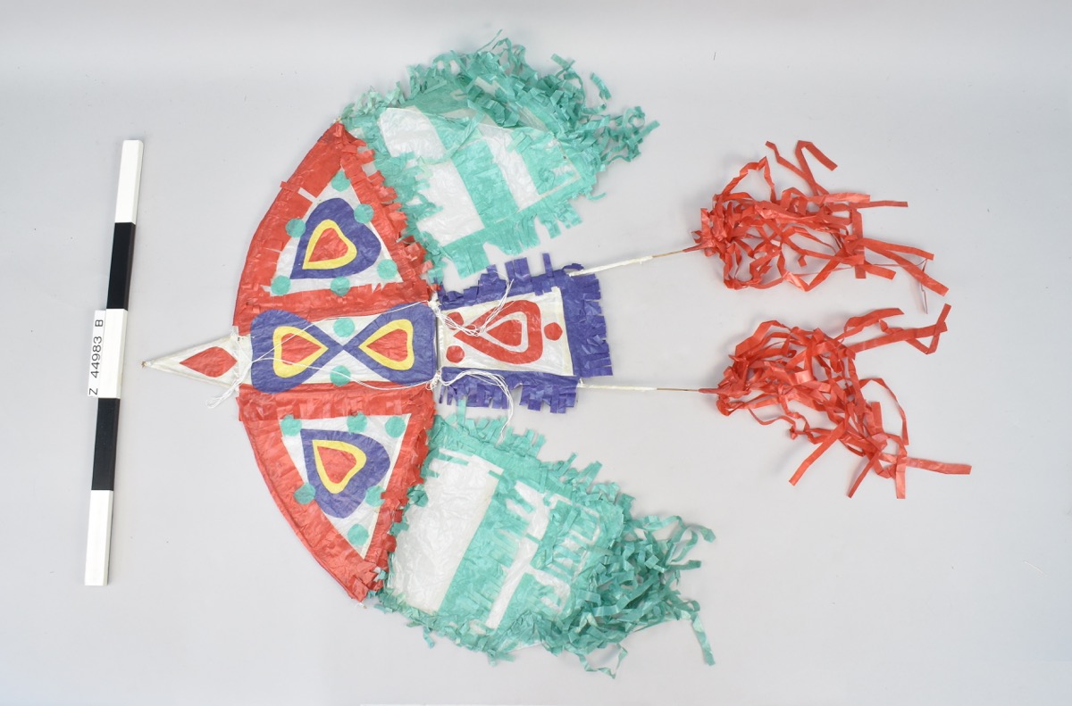 It is possible that this kite is part of the Skeat collection. In the annual report, the Skeat collection (Z 33508, Skeat I: 640-654) lists 15 kites from South East Asia, however there are only 10 record on the database. This kite needs to be compared to those in the Skeat collection to determine their provenance.