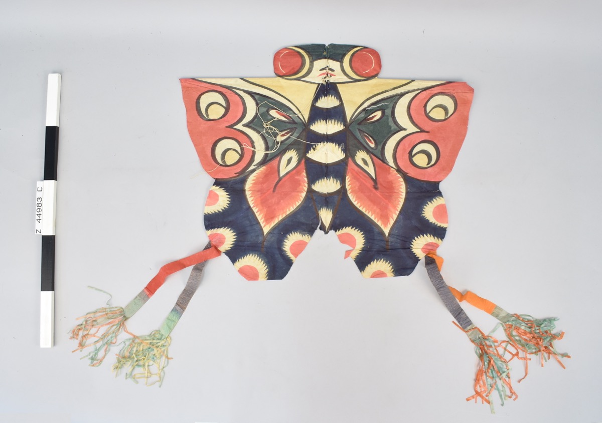 It is possible that this kite is part of the Skeat collection. In the annual report, the Skeat collection (Z 33508, Skeat I: 640-654) lists 15 kites from South East Asia, however there are only 10 record on the database. This kite needs to be compared to those in the Skeat collection to determine their provenance.