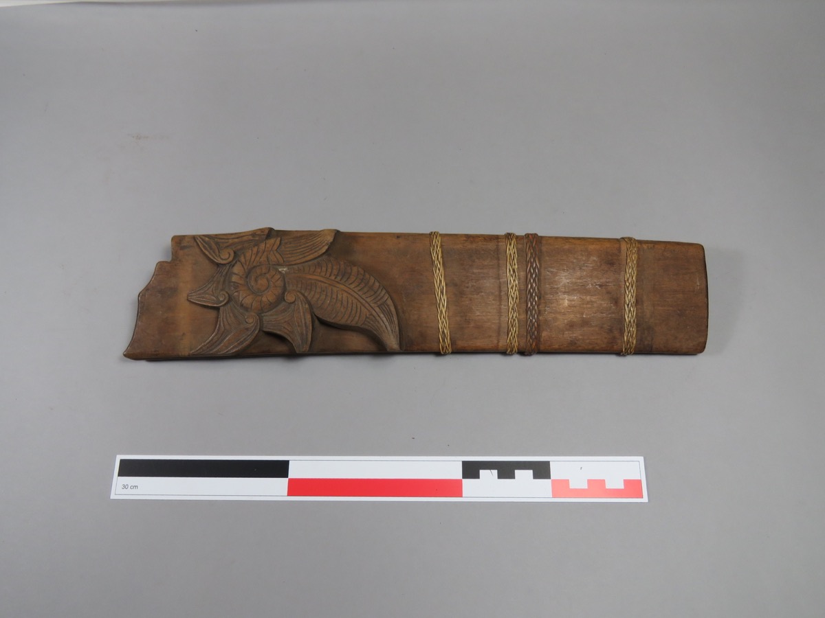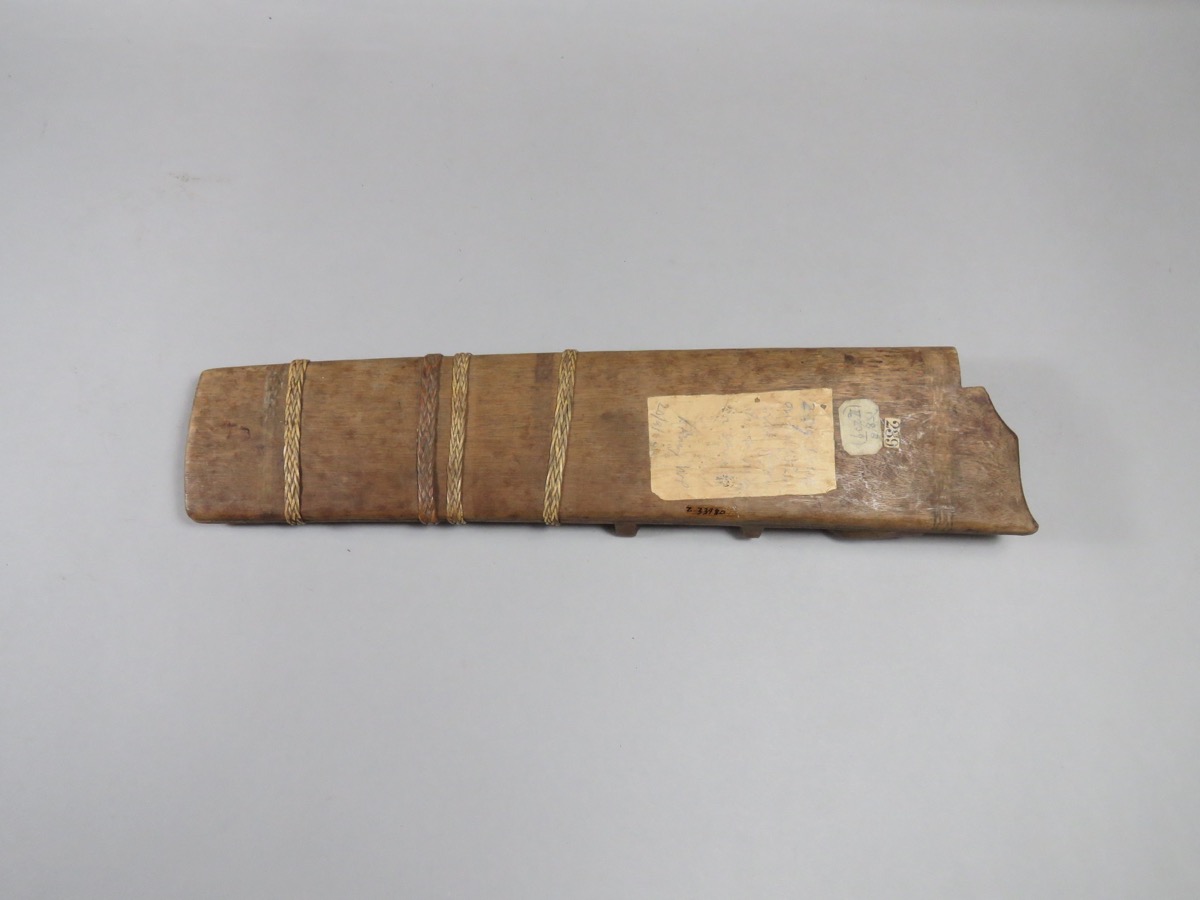 The blade is missing; The ' Ketika' design is a diagram of magic squares used for divination. The signs used being explained as follows; Nothing, ' Tanah merdheka' Danger, ' groh' Death, ' maut' Greatgain, ' Rejkibesar' Littlegain, ' Rejkikechil' . The vertical lines refer to the five hours or watches (divisions): the horizontal -seven days of the week; Collected by: Skeat.W.W