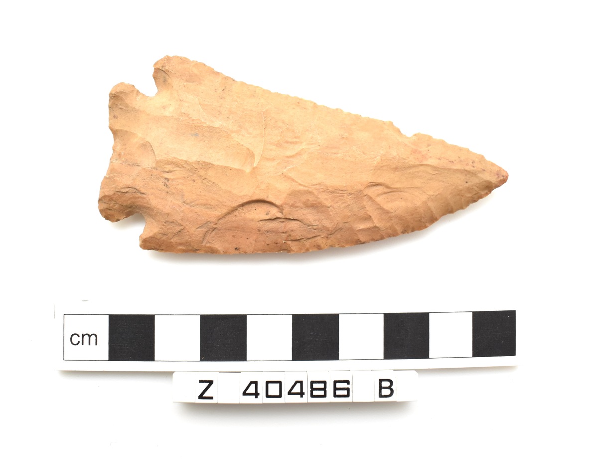 Z 40486 A-B: 'Two points of flaked brownish stone. Both are notched above the tang. Z 40486 A. Bevelled, with rounded tang. Z 40486 B. Splayed tang'