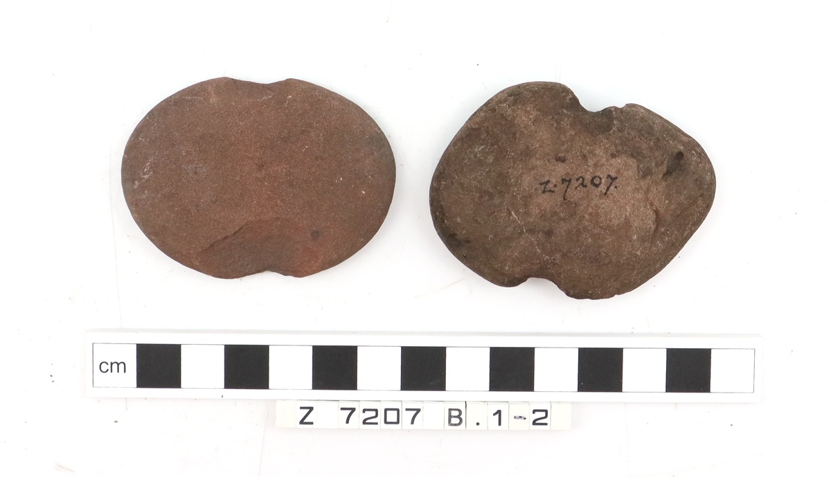 Two dark brown oval stone implements. Both have notches on the sides. Possibly net sinkers.