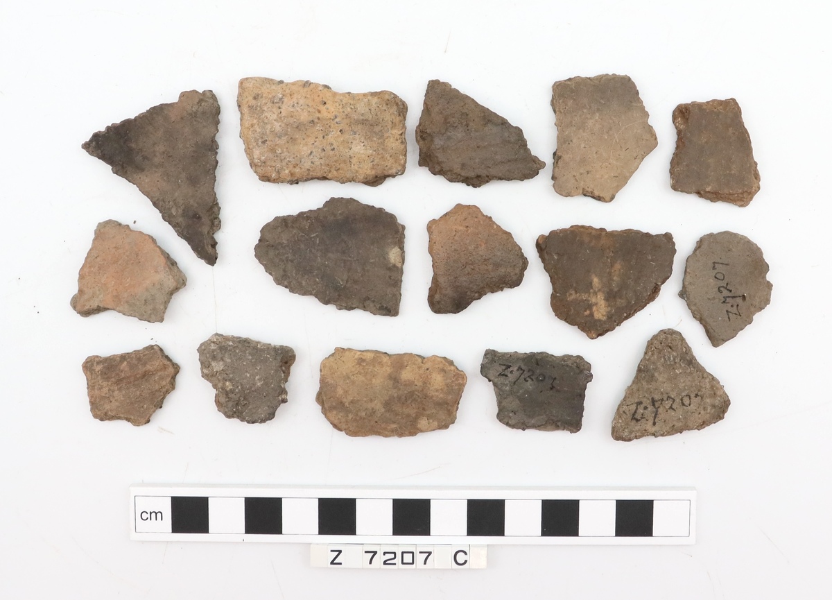 15 brown ware body sherds; sandy micaceous fabric. One with two horizontal scoring lines, the rest undecorated.