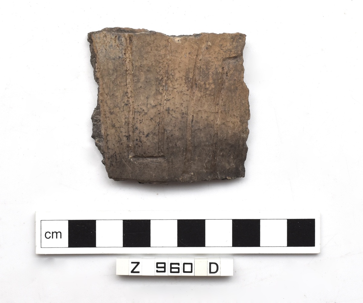 Sherd decorated with deeply incised grooves of rectilinear design, material brown in colour with blackened areas and dark grey core.