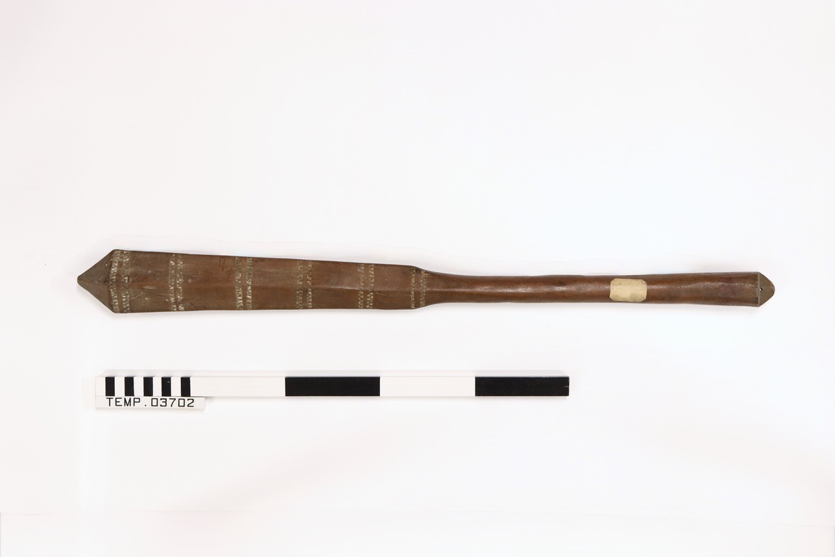 Anave. Dance club, rhomboid cross section with cylindrical shaft. shaft flares slightly towards the blade. Blade is decorated with surface carving and lime in-fill. Most of the lime is no longer there, but signs of lime still present. Suspension lug and drilled hole present at proximal end.