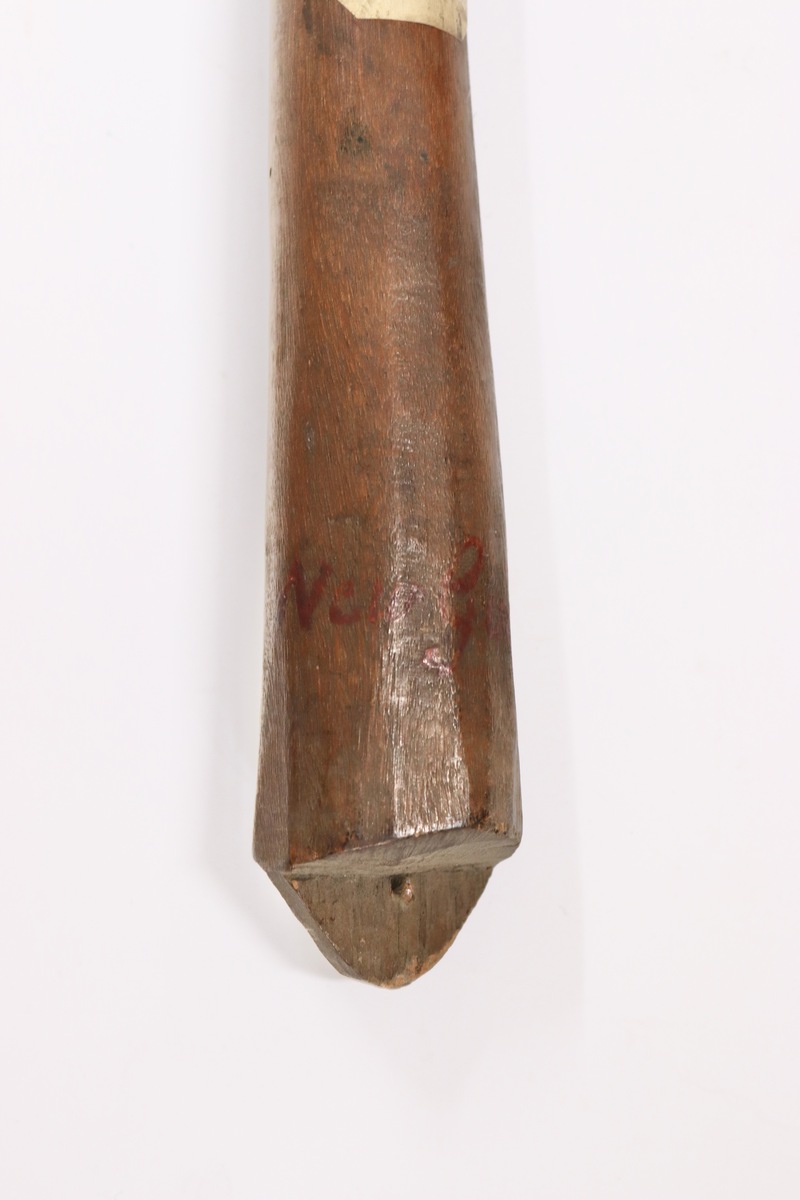 Anave. Dance club, rhomboid cross section with cylindrical shaft. shaft flares slightly towards the blade. Blade is decorated with surface carving and lime in-fill.