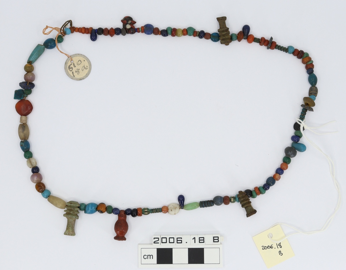 A string of multicoloured glass, carnelian, amethyst, and faience beads, pendants, and amulets such as Djed pillars.