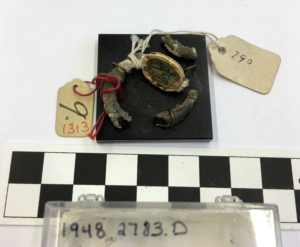 Faience or steatite scarab of Thutmoses III set in to a ring. heavily deteriorated.
