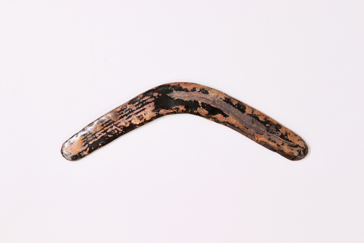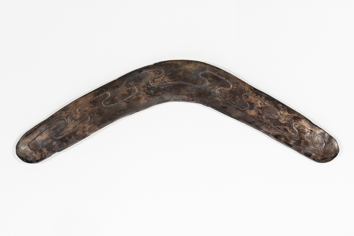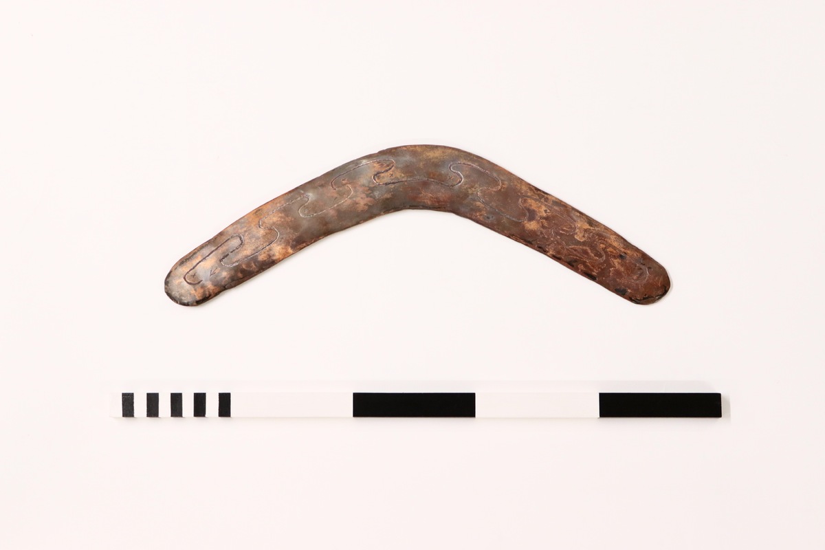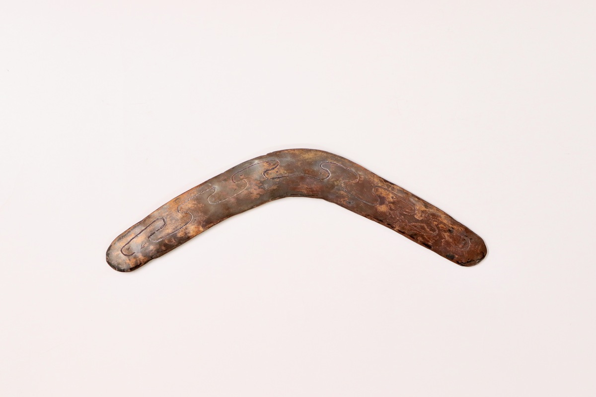 The process of making the wanna involved cutting out two pieces of copper and sanding down the edges. It was then welded together using copper wire. After sanding the piece again to ensure it was smooth like wooden boomerangs which are designed to glide through air, David engraved a pattern based on carved wanna he had seen in MAA and other museums. He included emu footprints and outlying camps to represent the travels and experiences shared with Eleanor along the Baaka (Darling River). The whole piece was then heated with fire, leading to a dark heat patina pattern on one side.