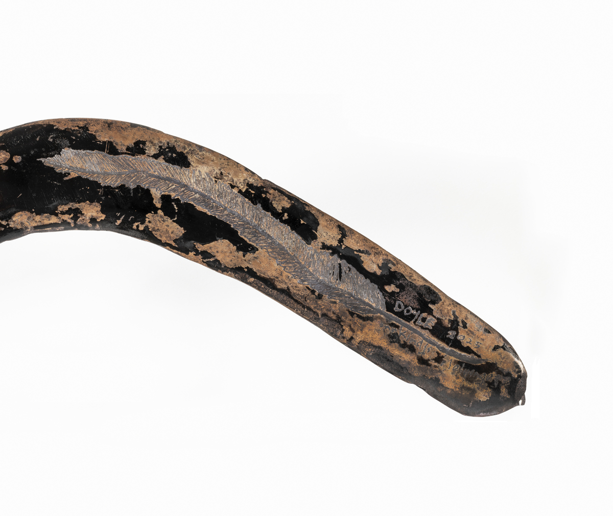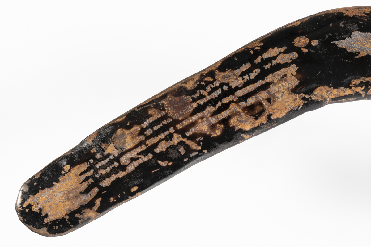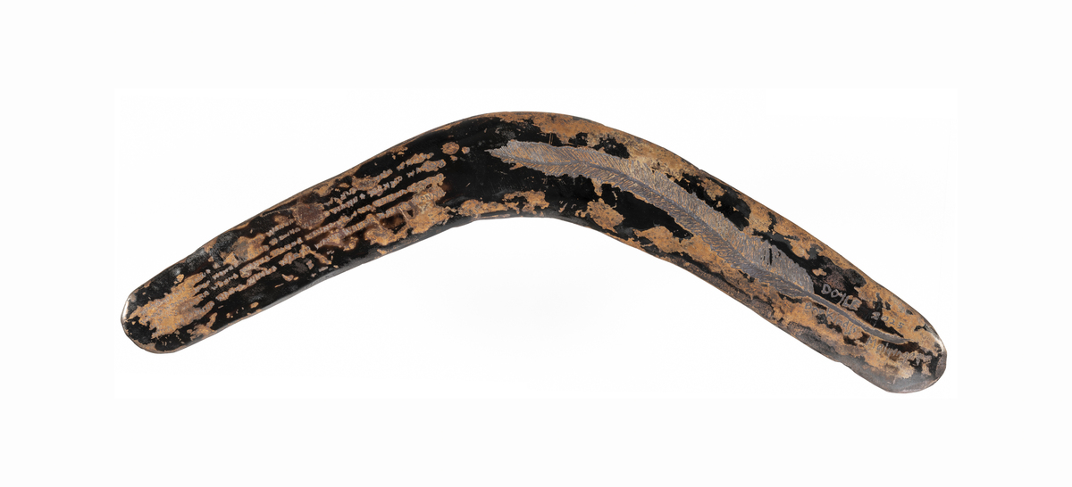 Ngaratya Kirra-thika (Together on Country) by Barkindji/Malyangapa artist David Doyle, 2025. Copper wanna (boomerang) engraved on one side with the flowing lines of the Baaka (Darling River), emu tracks, and outlying hunting camps. Reverse with dark heat patina and the word wanna repeated in four curved lines across half of surface. Other half has engraved emu feather and David’s signature.