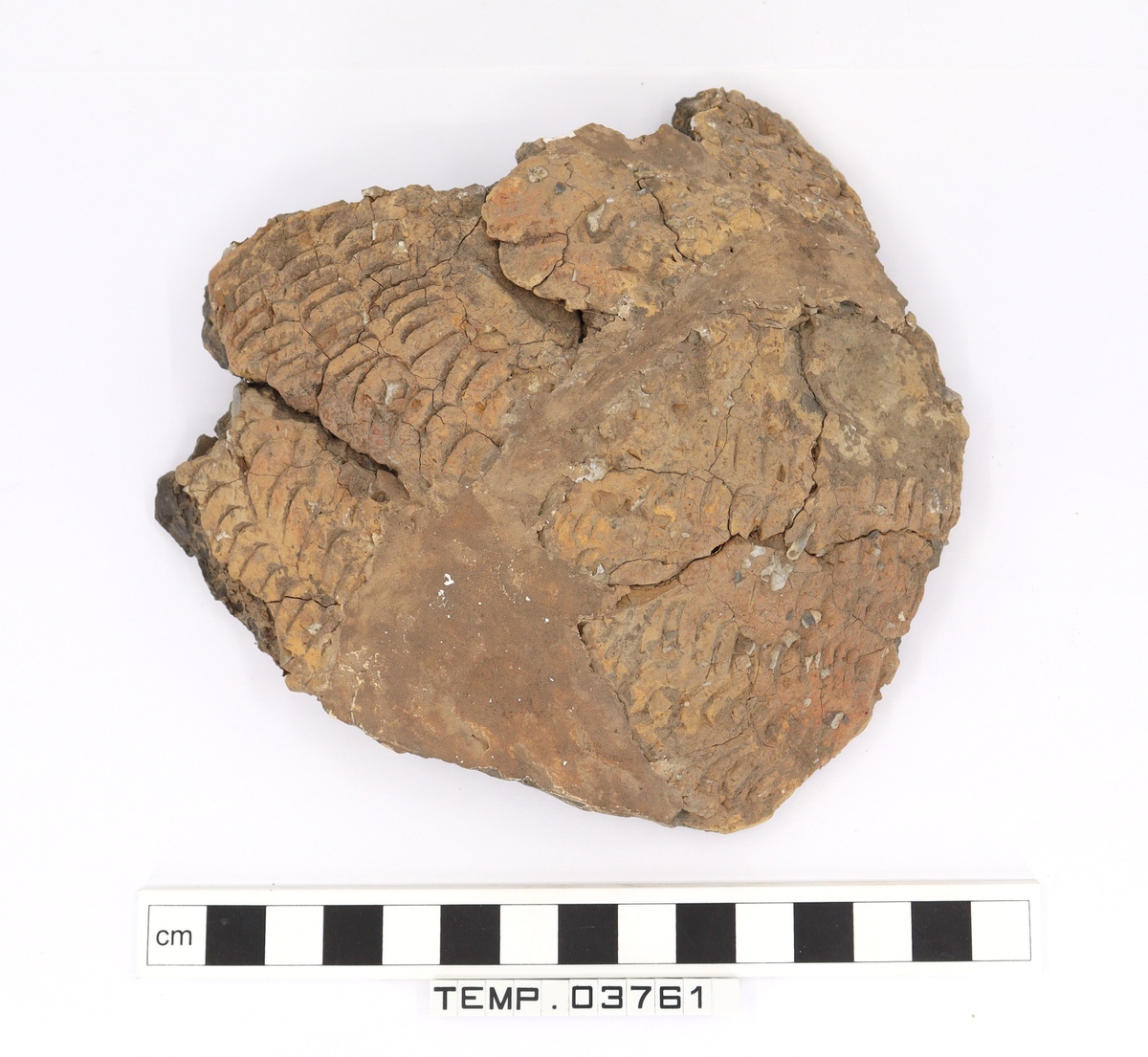 Body sherd decorated with fingernail impressions. Reconstructed using sherds and infill.