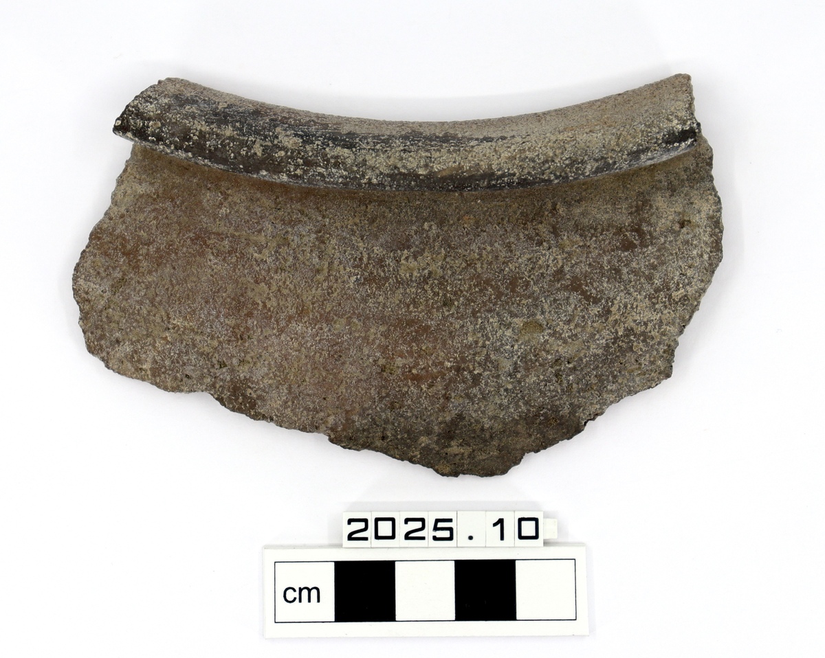 A rim sherd, possibly from a funerary urn. Everted rim with the remains of paint around the edge.