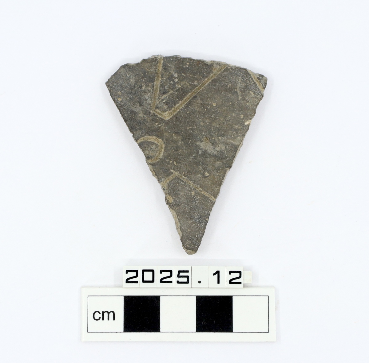 A small body sherd of a grey ware, with incised geometric shapes.