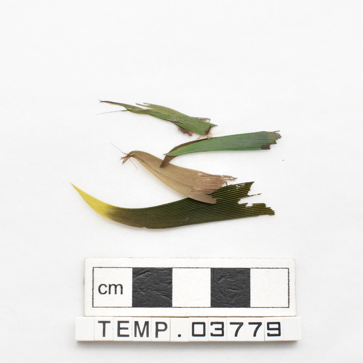A few feather fragments were found in a bag in conservation drawers moved from Shorts to the CMC. The feathers are green and iridescent, and since they came from Shorts are likely to have become detached from a South American object. With feathers of matching size and colour, only three records have a conservation cleaning note: E 1902.218.1-3, 1956.91.1-3 and Z 19078 A. Other possibilities are E 1898.43, E 1902.242, 1946.275 B, Z 11340 B, Z 11344, Z 11350 A-B, Z 47005 A-B or Z 47006 A-B. It is unlikely to be possible to definitely match the fragments back up, so they have now been assigned a temp number, TEMP.03779.