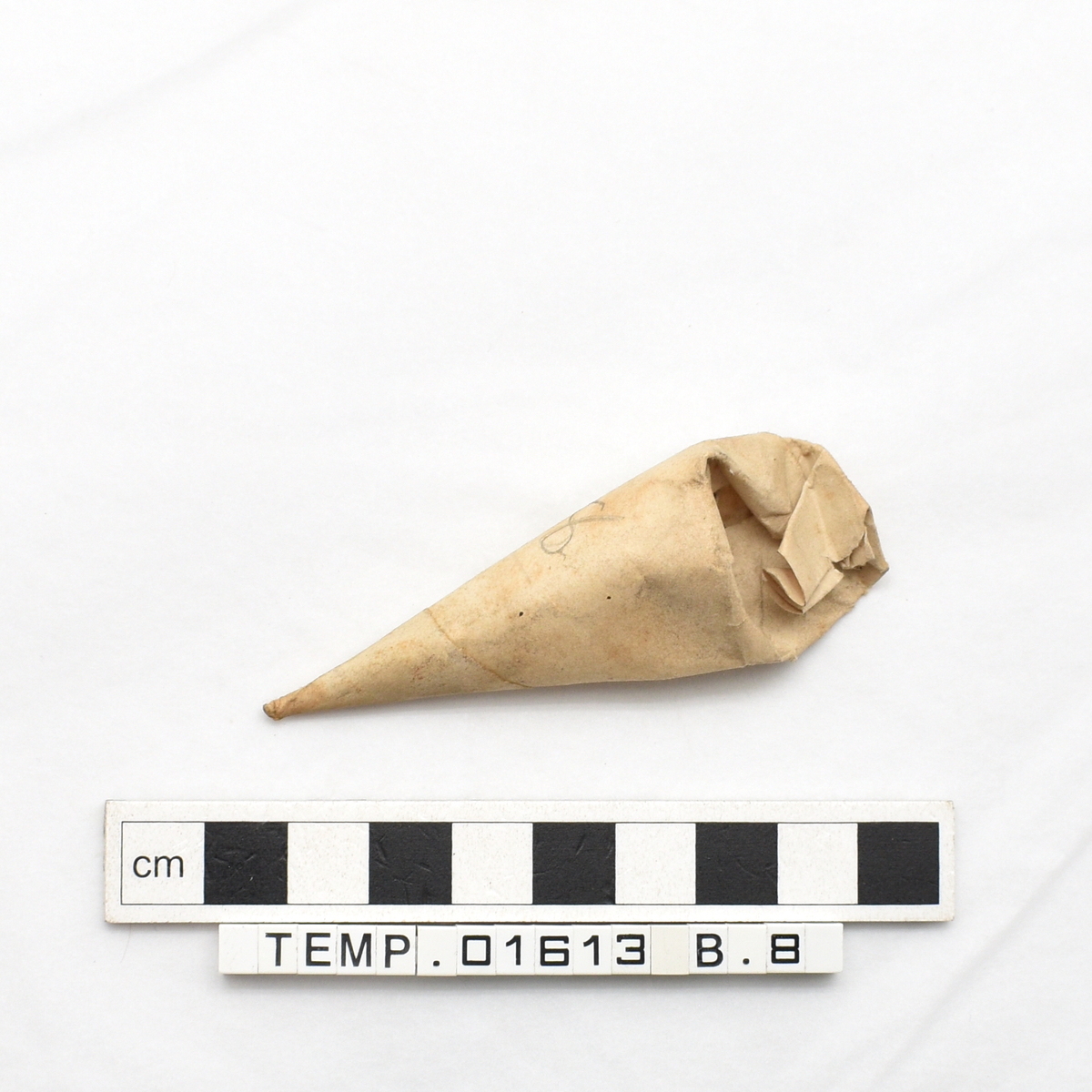Conical paper parcel containing botanical material, possibly used as medicine. Contains small, light brown seeds, possibly anise.