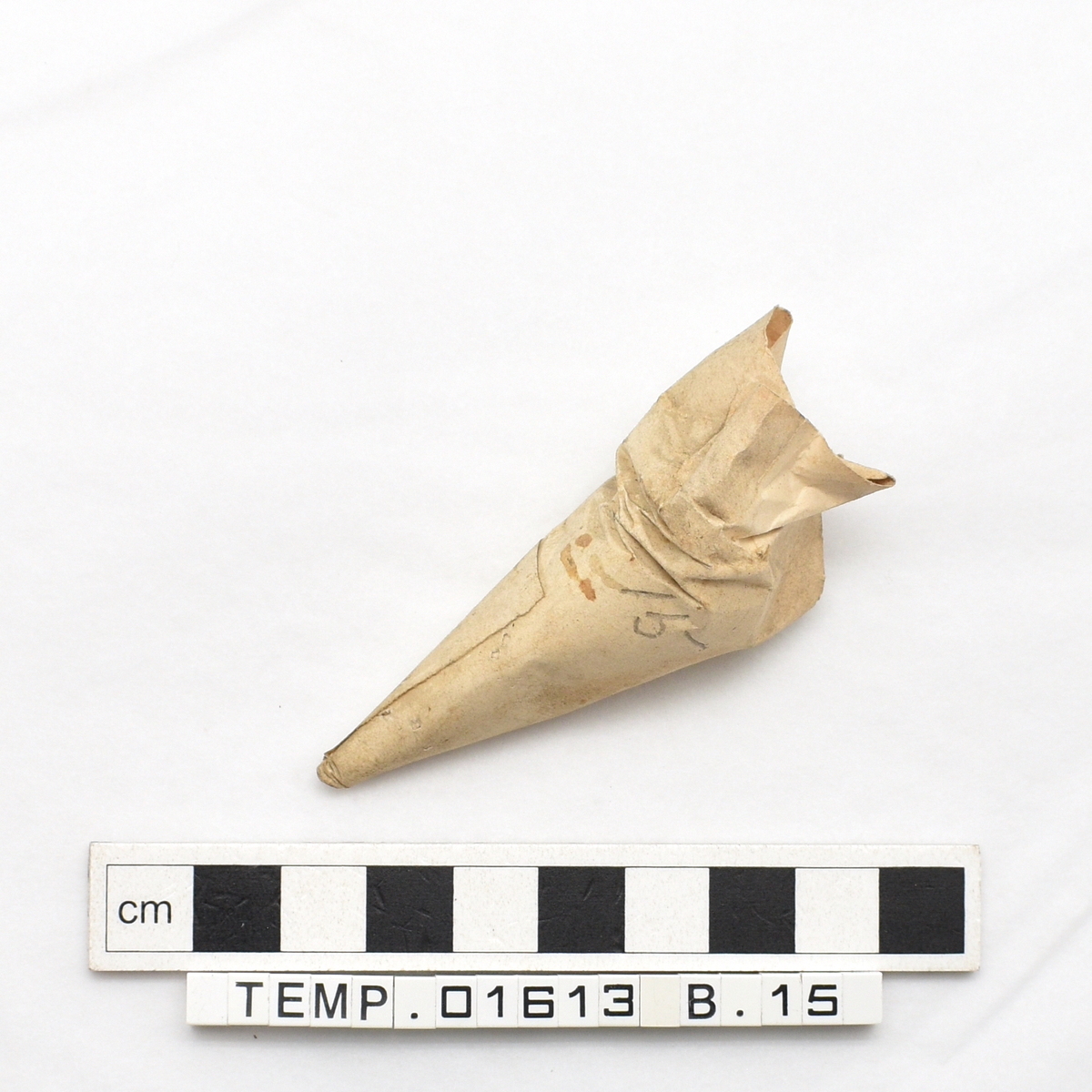 Conical paper parcel containing botanical material, possibly used as medicine. Contains black spherical seeds, possibly black pepper.