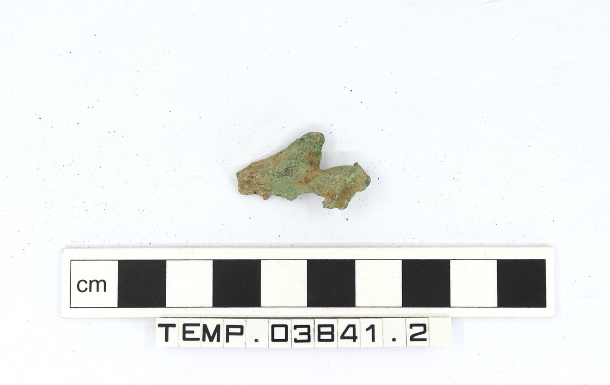 Slag. More or less distorted and corroded copper-green coloured fragment of metal, mostly showing signs of having been cooled quickly from the molten state. Could represent effects of a fire on some coins.