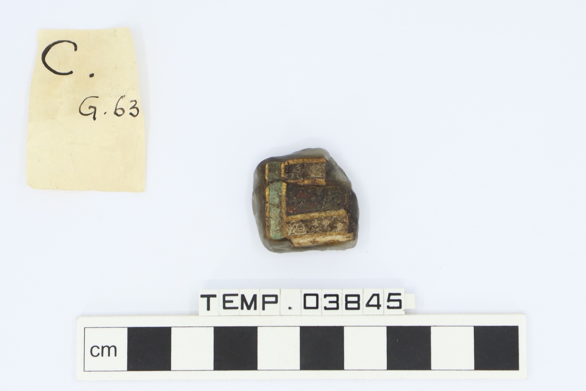 Myers (1940): G.63 was found with a curious group of metal objects, M.135, which is believed to be part of a magician's outfit. When found the only part of the pattern apparent was a section that might have contained a hieroglyph, a very likely object for a magical outfit [p.119].