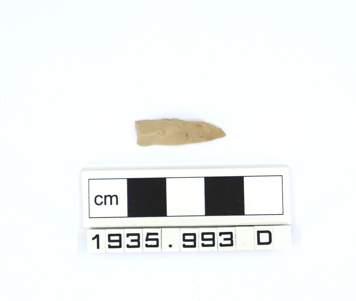 Description for 1935.993 A-N: '14 flint implements : A, B, C, H: Tranchets; D, E, F, G, I, J, K, L, N: Backed blades; M: Burin'